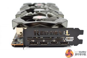 Video outputs are the same as reference, with 3x DisplayPort and 1x HDMI. PowerColor has also placed three red LEDs just above these ports, meaning you can easily find them if you're trying to connect a display cable in the dark.