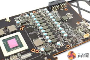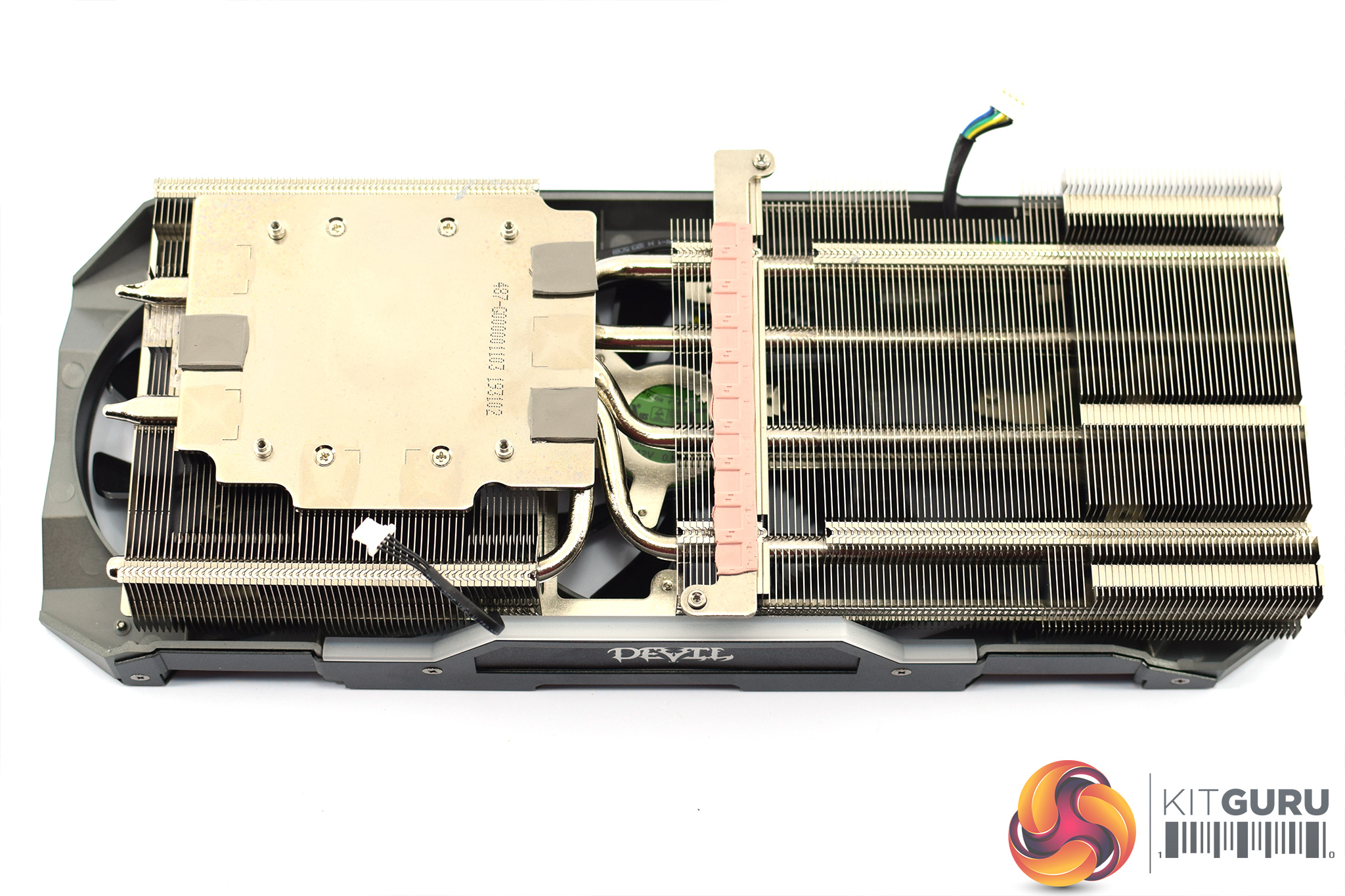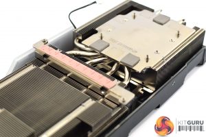 As for the cooler, this is a pretty hefty unit that is comprised of two separate fin stacks. 5x 6mm heatpipes draw the heat away from a single baseplate that contacts with both the GPU and the VRAM. There is another, much thinner coldplate to cool the MOSFETs just to the right of this.
