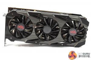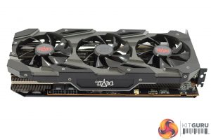 As for the those fans, we obviously have three and each measures 90mm across. I'm not too keen on the glossy plastic used for these as I feel it cheapens the overall look slightly, but unless you mount the card vertically you won't see them once the card is installed. There is also a fan-stop mode where the fans stop spinning once GPU temperature drops below 60C.