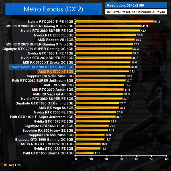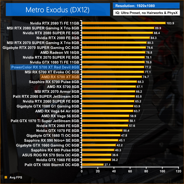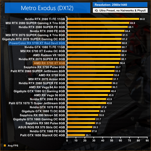 Metro Exodus shows consistent gains for the Red Devil, with the card 3% faster than reference at 1080p and 4K.