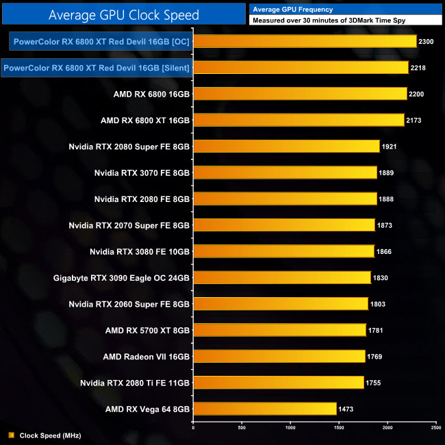 Looking at the average clock speed of the Red Devil, it's no surprise to see the OC BIOS running faster than the Silent BIOS. The latter mode hits 2218MHz, while the OC BIOS is able to deliver an extra 82MHz. Both modes are faster than the reference design, which averaged 2173MHz.