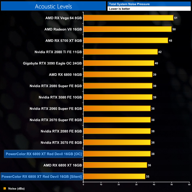 For noise levels, we’ll start with the OC BIOS. This option sees the fans run at 45%, or 1350rpm, producing 38dBa on our noise meter, so it’s very easy on the ears. It is slightly louder than the reference card in this mode, but it’s also running faster with a higher power target.