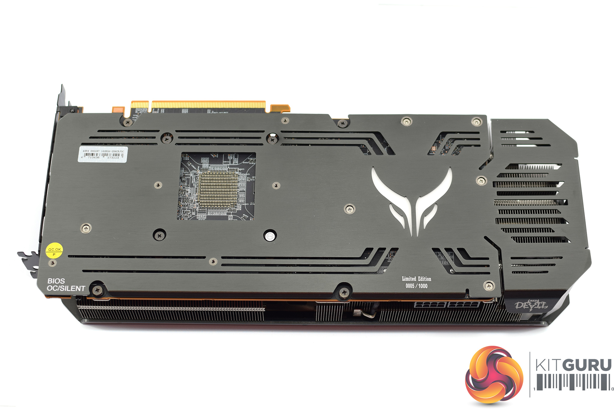As for the backplate, this is a full-length aluminium plate in a dark/gunmetal grey colour, while there's plenty of cut-outs and ventilation for the back of the PCB. That Red Devil logo visible on the back is illuminated by RGB LEDs once powered on. We can also note our sample is listed as number 5 of 1000 limited edition units.