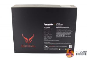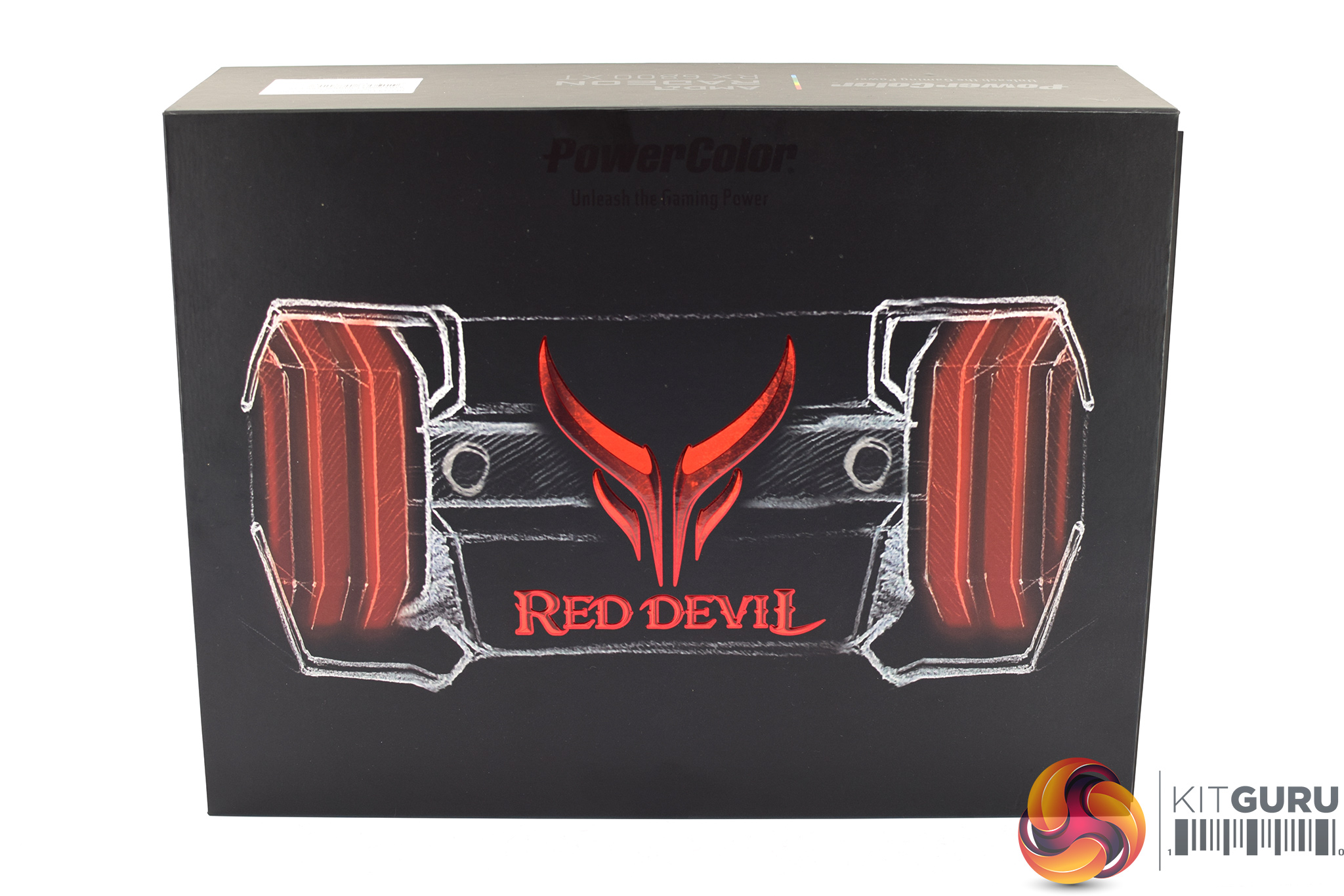The PowerColor RX 6800 XT Red Devil ships in a black box, with the Red Devil logo positioned right in the middle.