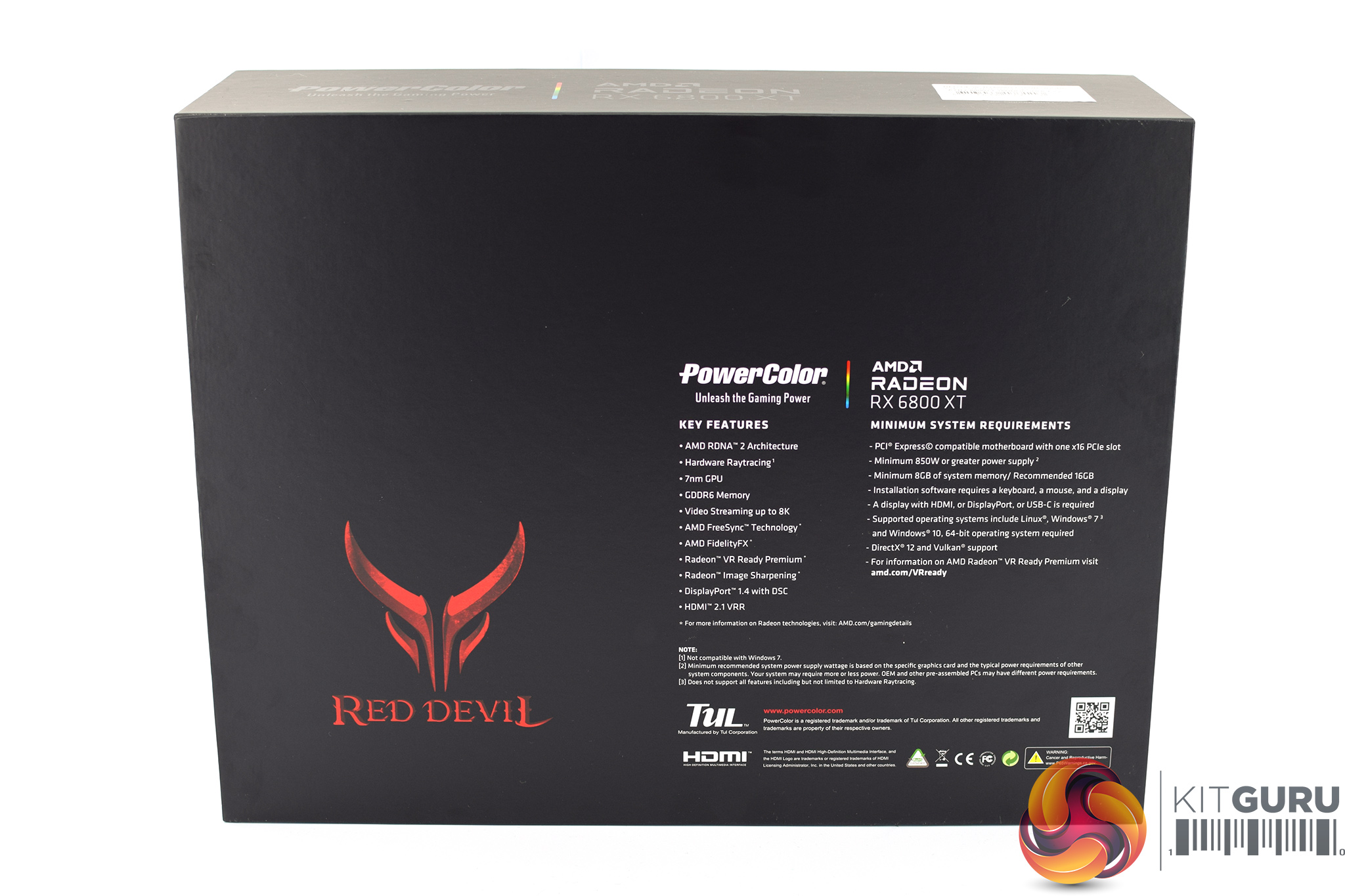 On the back, PowerColor highlights some key features of the GPU, as well as the minimum system requirements.