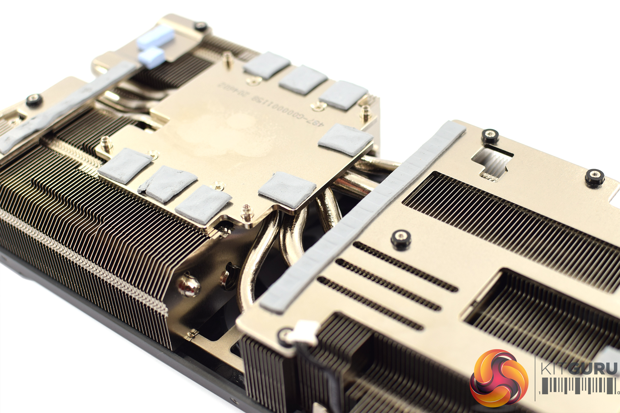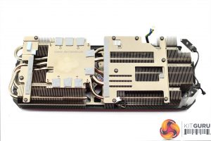 As for the heatsink, it’s a very hefty unit, comprised of two separate finstacks. There’s a total of seven heatpipes, three of which measure 8mm in diameter, while the rest are 6mm. Both the GPU die and the GDDR6 memory contact with a plated copper baseplate, while there’s a separate plate that contacts with the VRM.