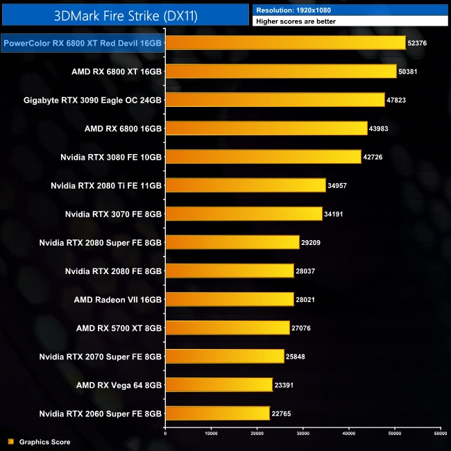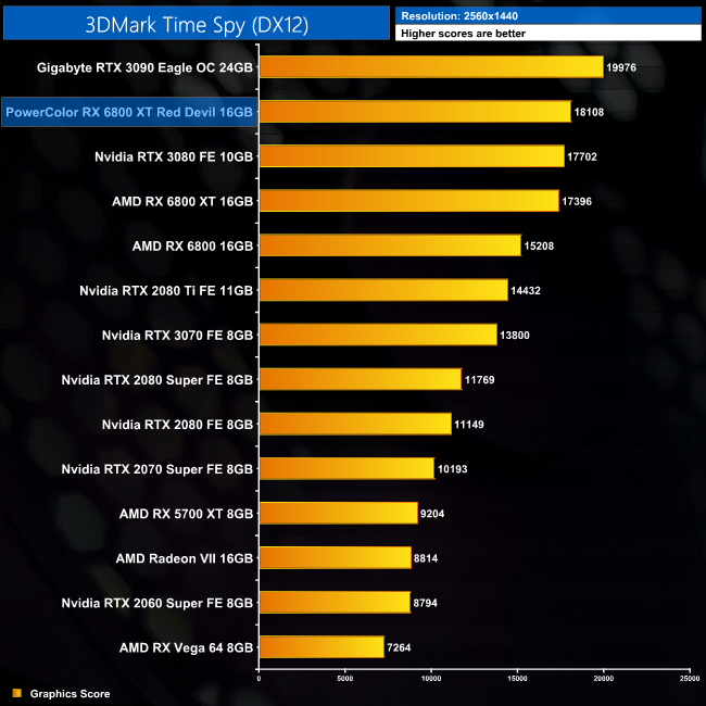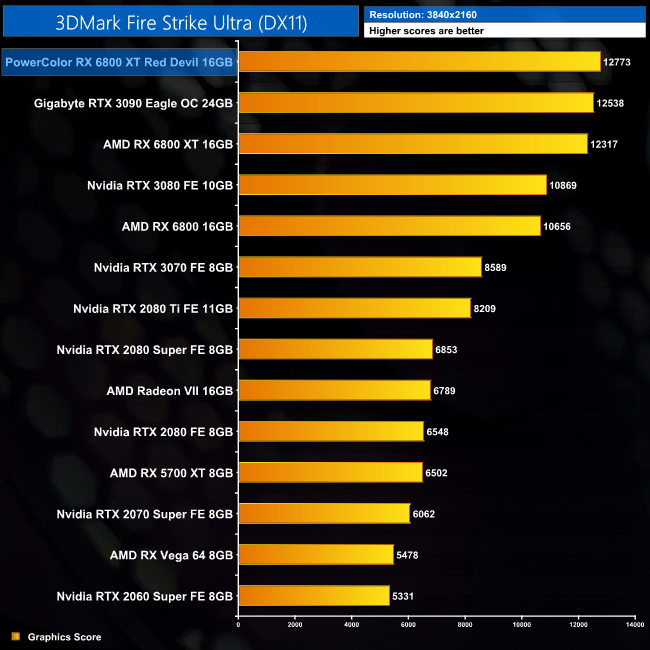 Starting off our testing with 3DMark, the performance from the Red Devil is 4% faster than the reference RX 6800 XT across every test. That means it takes top spot in both Fire Strike and Fire Strike Ultra, while it comes second in Time Spy.