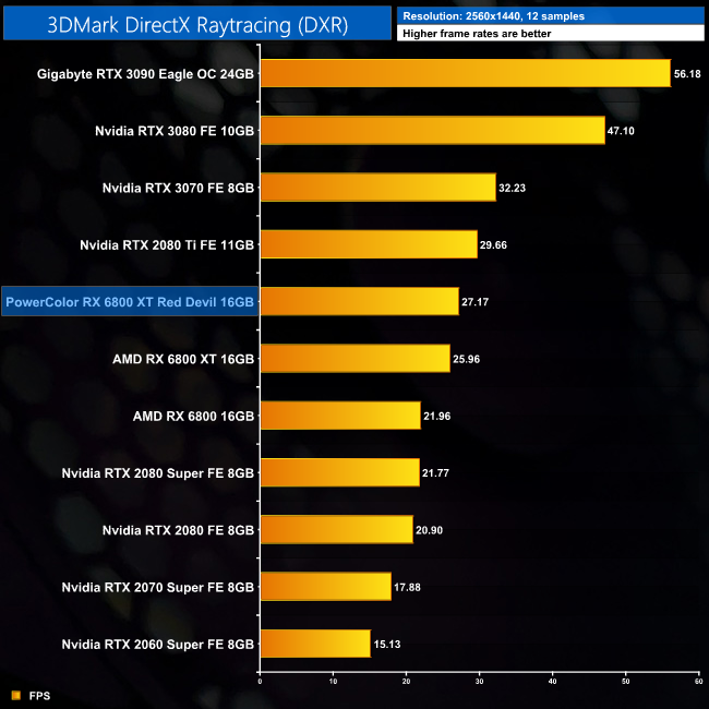 For the DirectX Raytracing feature test, the Red Dvil manages 27.17 FPS, an increase of 5% compared to the reference 6800 XT, but it is still 8% behind the RTX 2080 Ti.