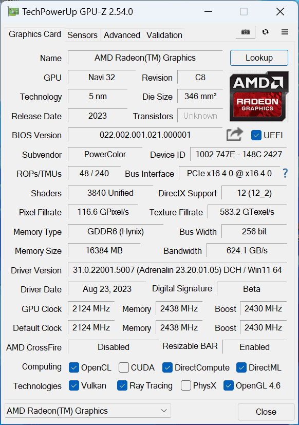 Meanwhile, the memory configuration is almost identical to the previous generation RX 6800 XT. We still find 16GB GDDR6 operating over a 256-bit interface, but this time the memory clocks in at 19.5Gbps, up from 16Gbps. This gives a memory bandwidth of 624 GB/s, though AMD claims an ‘effective' bandwidth of 2708.4 GB/s due to the 64MB of 2nd Gen Infinity cache.