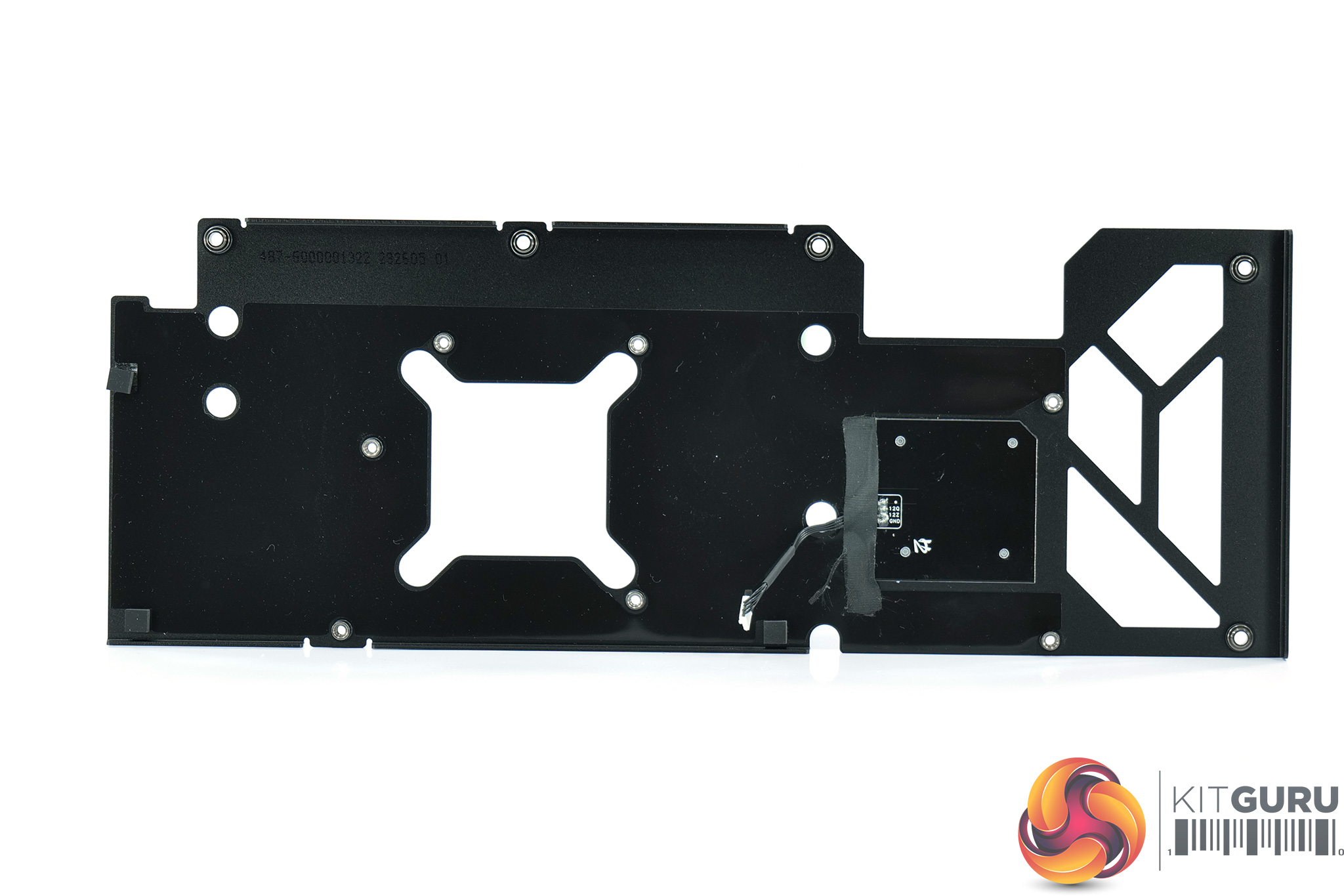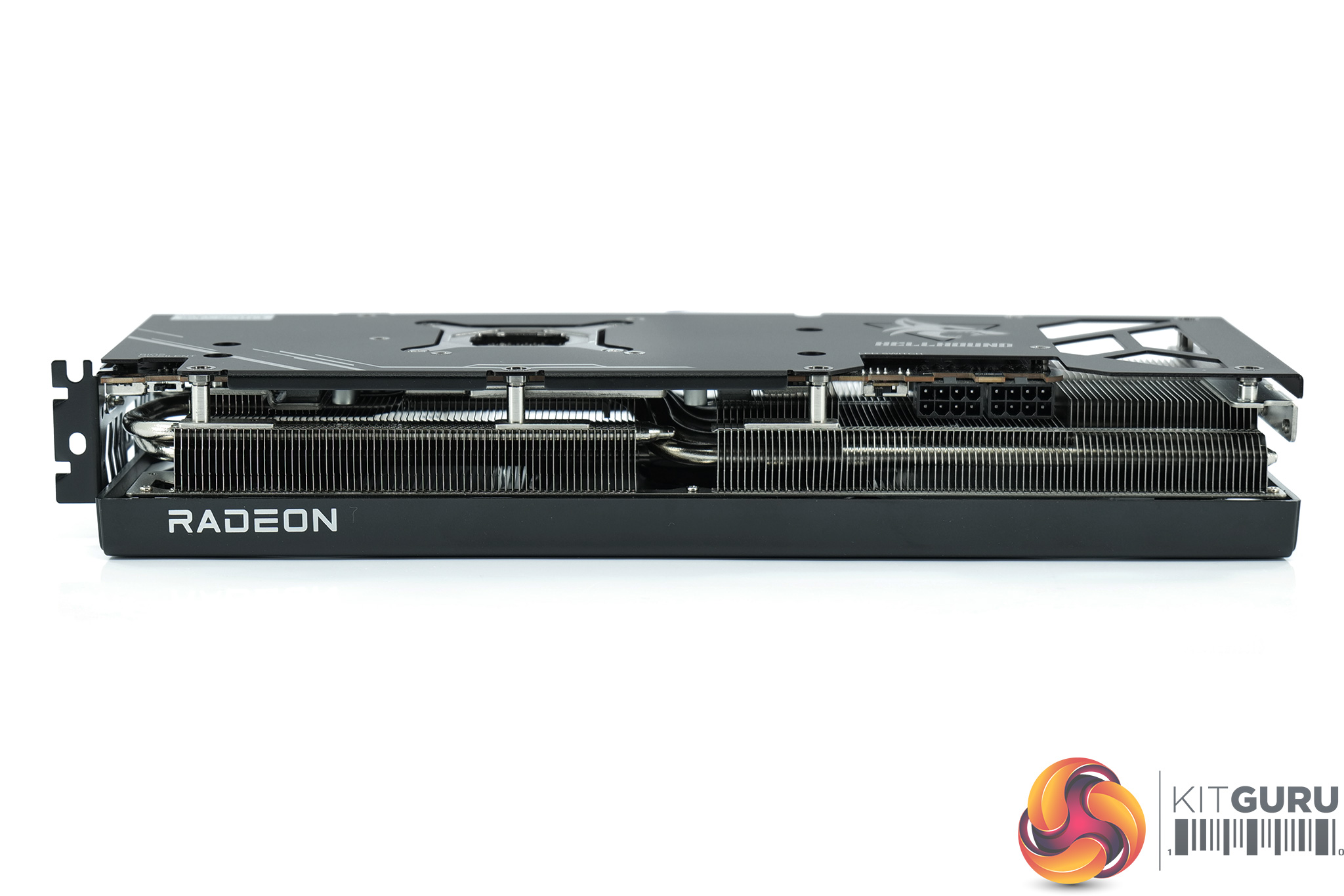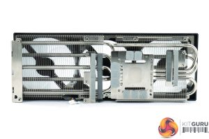 The cooler, meanwhile, utilises two hefty fin stacks, connected by a total of 5x 6mm heatpipes. The GPU die and memory modules contact with one baseplate, while there are a couple others to cool the VRM.