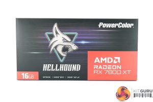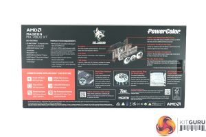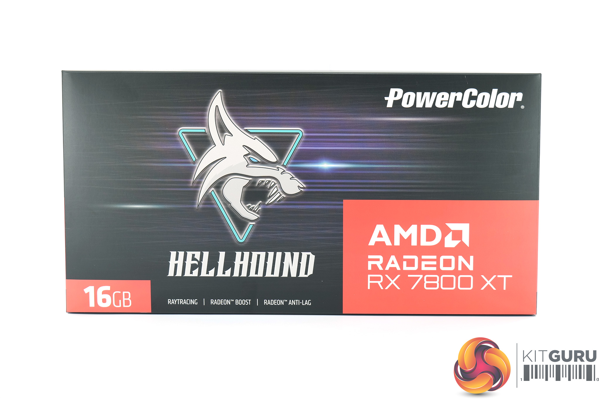 The PowerColor RX 7800 XT Hellhound ships in a mostly black box, but with the Hellhound logo dominating the front. AMD Radeon branding is positioned in the bottom left corner. On the back, PowerColor highlights various key features of the card, as well as system minimum requirements.