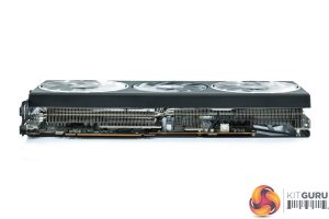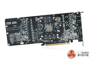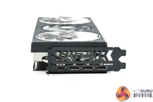 The front side of the card is left very open, allowing a good chunk of hot air to escape from the heatsink. As for the backplate, this is made of metal and spans the length of the card, but with four small cut-outs towards the end to allow air to pass through the heatsink. We can also note the dual-BIOS switch positioned next to the I/O bracket, giving users a choice of either the OC or Silent modes. The OC BIOS increases power, clocks and fan speed compared to Silent, but we test both later in this review.