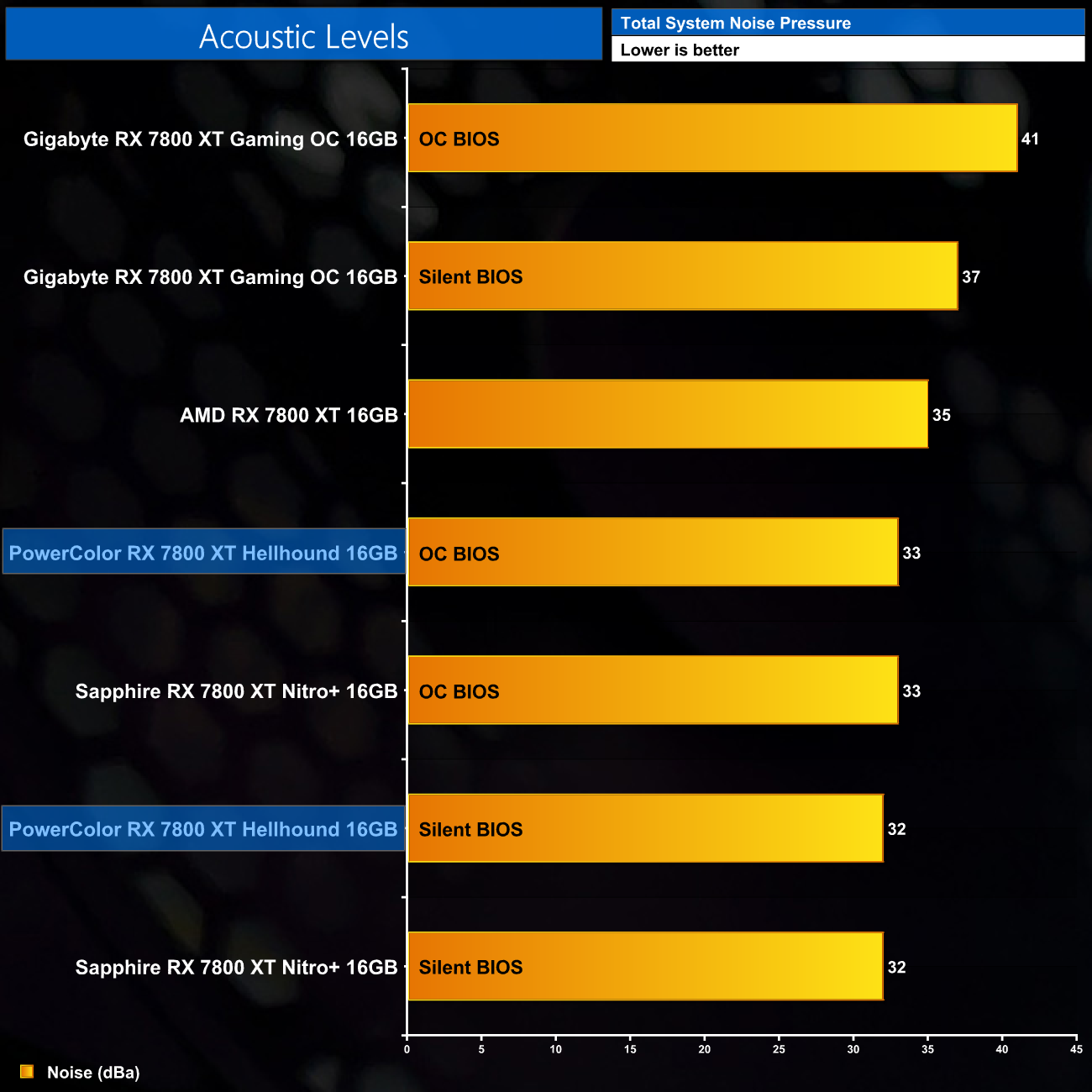We take our noise measurements with the sound meter positioned 1 foot from the graphics card. I measured the noise floor to be 32 dBA, thus anything above this level can be attributed to the graphics cards. The power supply is passive for the entire power output range we tested all graphics cards in, while all CPU and system fans were disabled. A reading under load comes from running Cyberpunk 2077 for 30 minutes for 30 minutes.