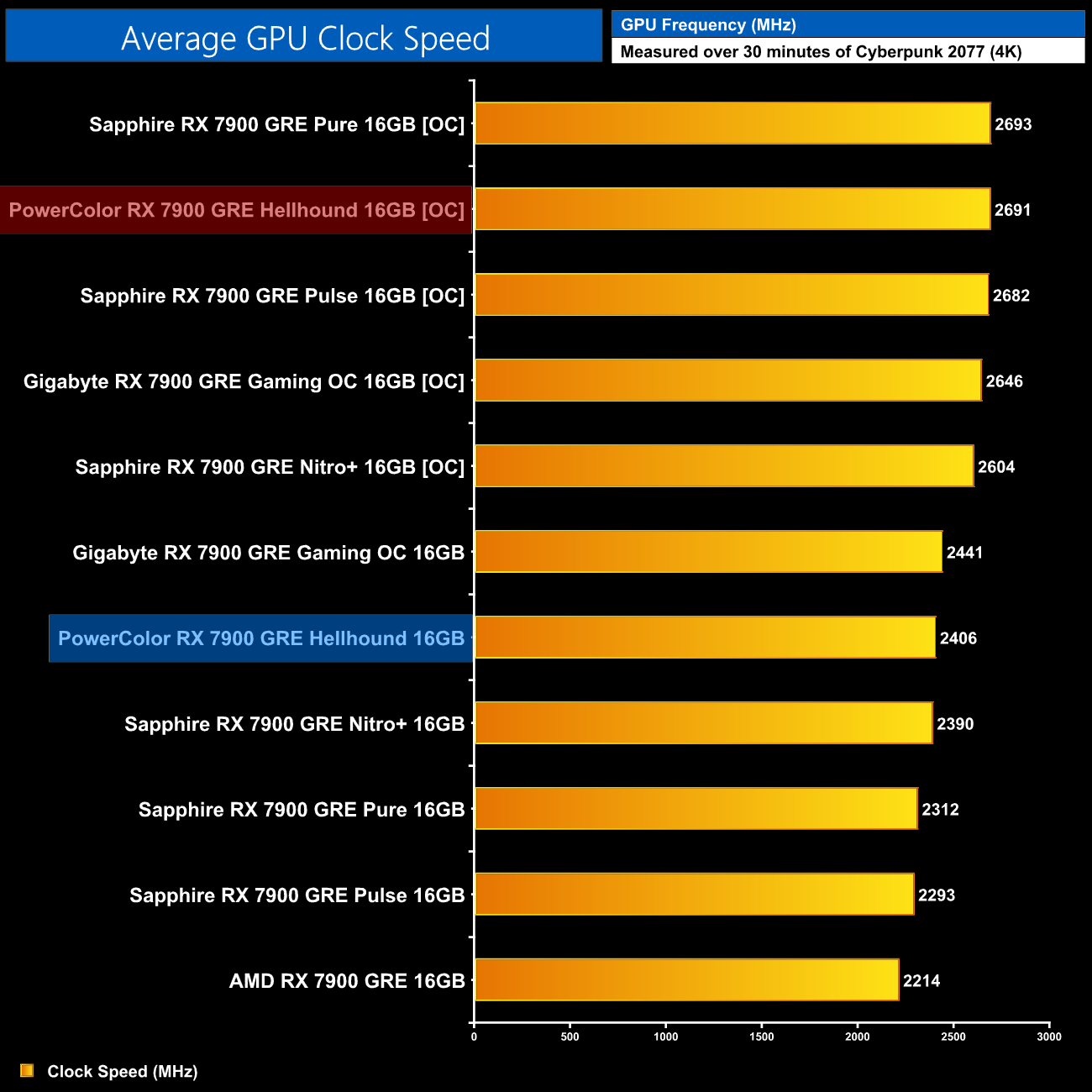 This saw the Hellhound run at just under 2.7GHz, closely matching the Sapphire Pure for clock speed.