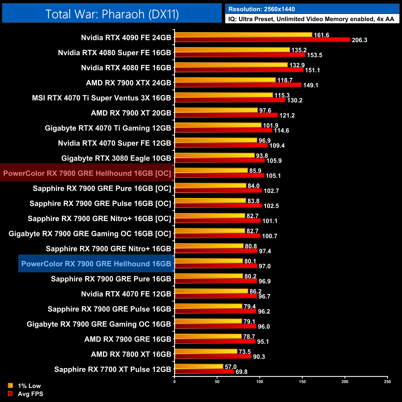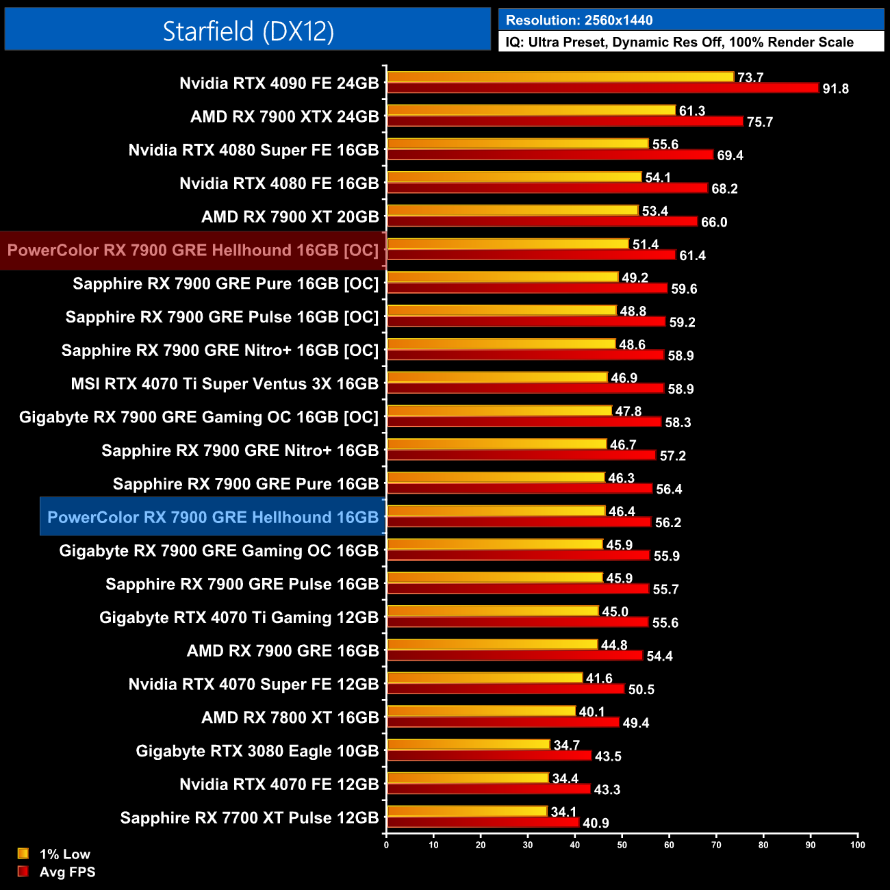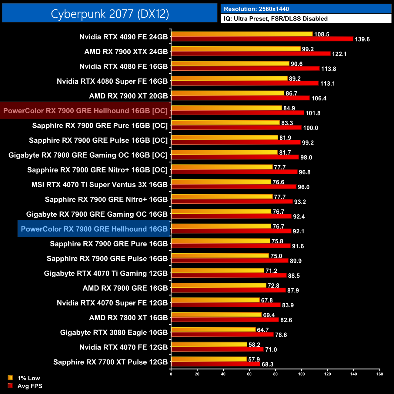 While the extra memory headroom didn't result in much difference compared to the other AIB cards when overclocked, if we compare to a stock-clocked reference 7900 GRE, the overclocked Hellhound is able to run 8-15% faster depending on the game – so the gains looks quite reasonably in that regard!