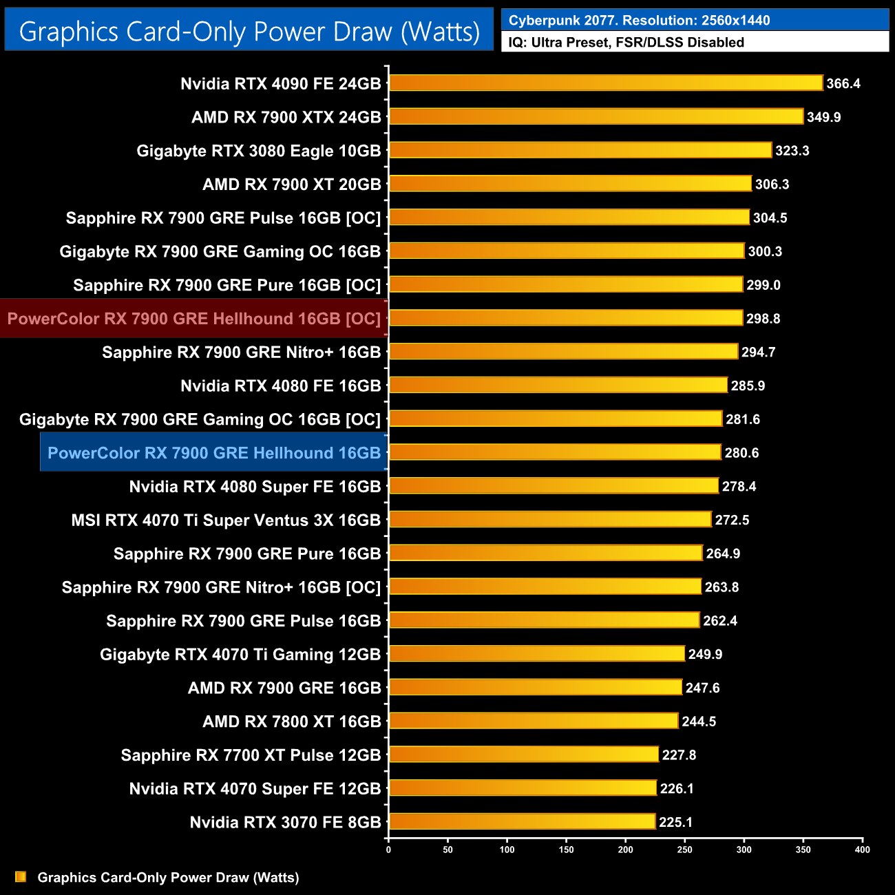 Of course, power draw does increase when overclocking, and we saw the Hellhound pull just under 300W – which is about 50W more than the stock-clocked reference card.