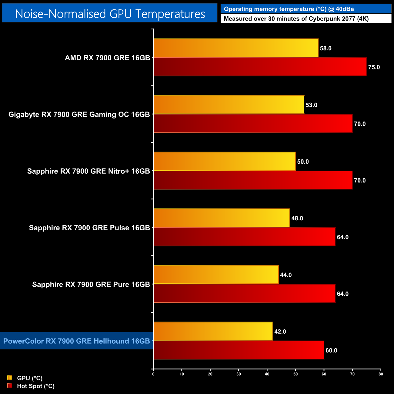 We then increased fan speed until we hit 40dBa noise, and re-tested thermals. It's not a surprise to see the Hellhound running the coolest of the bunch, with a hot spot that's 4C lower than the Sapphire Pure.