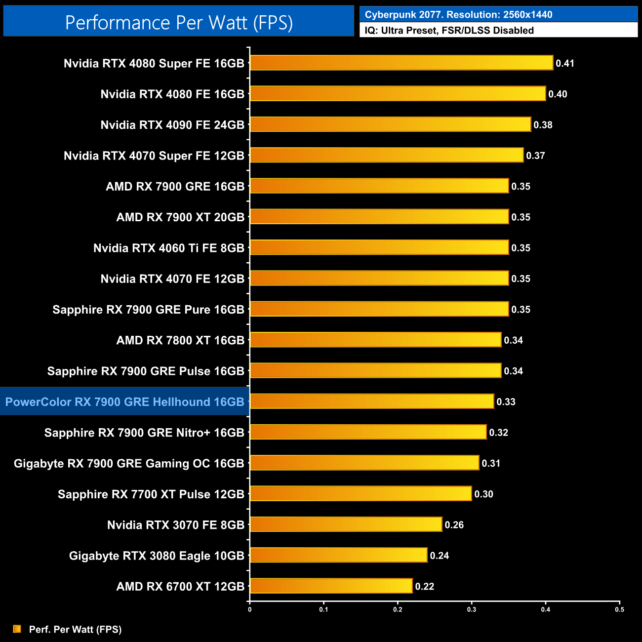 We use Nvidia PCAT to measure power draw of the graphics card only, with readings from both the PCIe slot and the PCIe power cables combined into a single figure. We use Cyberpunk 2077 (1440p) for this testing.