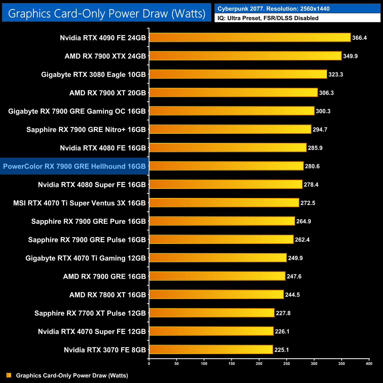 Power draw is higher than all the 7900 GRE cards we've tested, with the exception of the Nitro+, given the Hellhound hit 280.6W.
