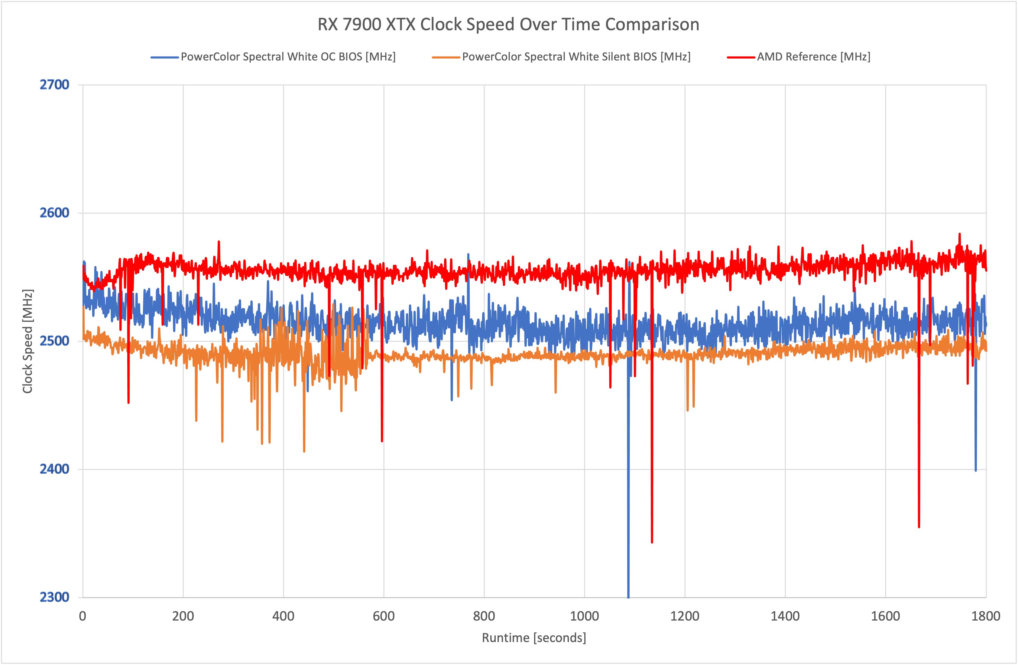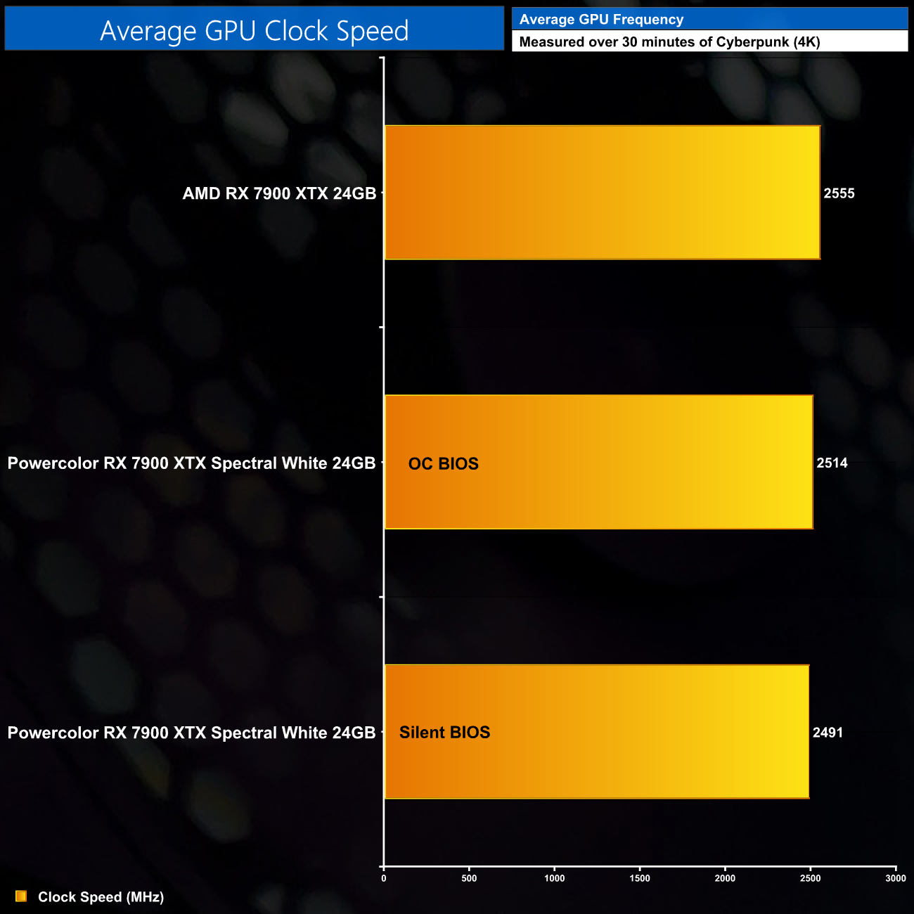 Looking now at clock speed, it was interesting to see that the Spectral White actually came in a fraction slower than AMD’s reference card. Not by much, but over the 30-minute stress test, the OC mode averaged 2514MHz, compared to 2555MHz for the reference card, while the Spectral White Silent BIOS came in at 2490MHz. These are very fine margins though, and explain why gaming performance is so close between the two cards.