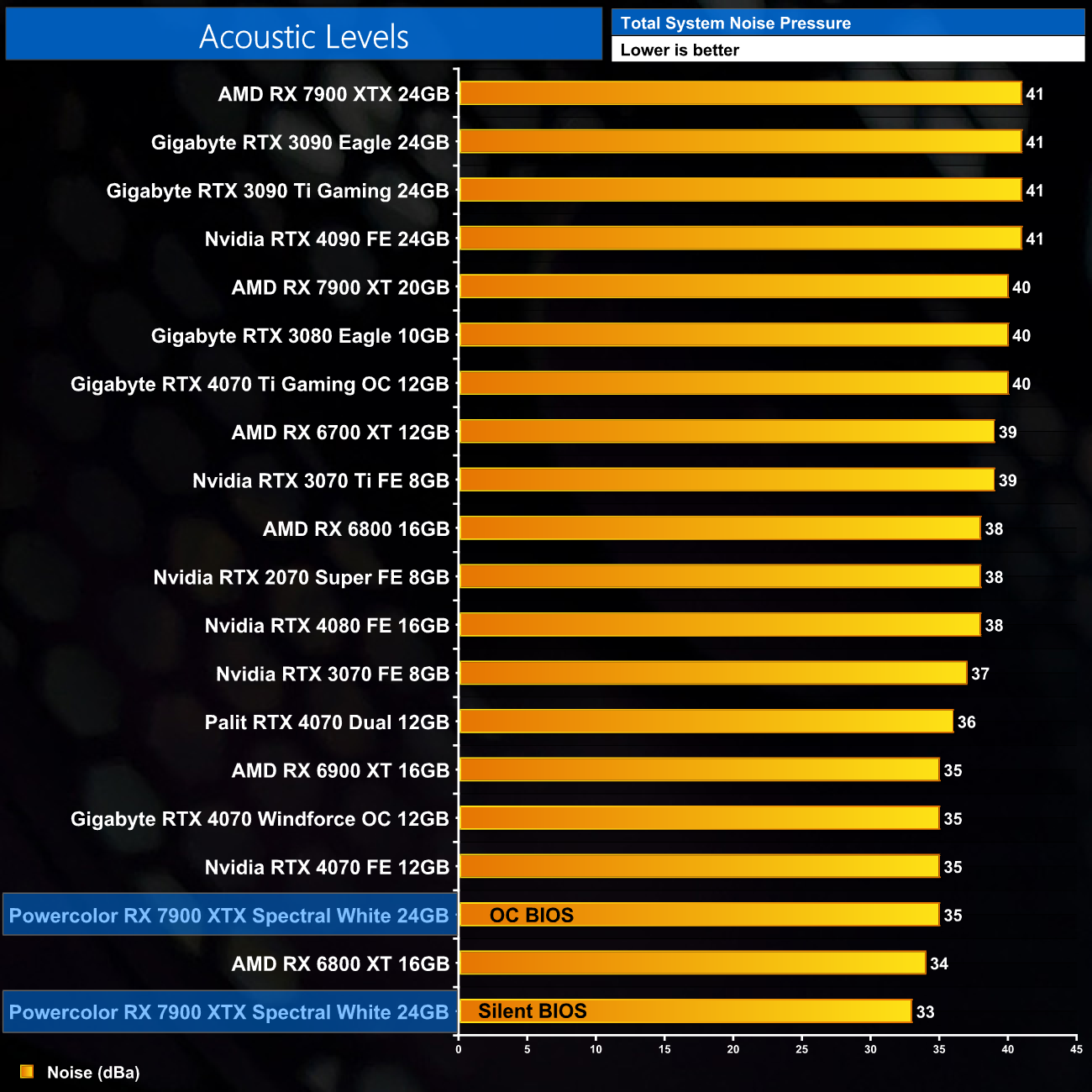 The Spectral White may not run massively cooler than AMD’s own design, but the real benefit comes in terms of noise levels. The OC BIOS operated the fans at 42%, or just 1200rpm, producing 35dBa on my sound meter, which is already a huge reduction in noise against the reference card. Switch to the Silent BIOS however, and fan speed drops to 37%, a mere 1000rpm, producing noise that measured in at just 33dBa.