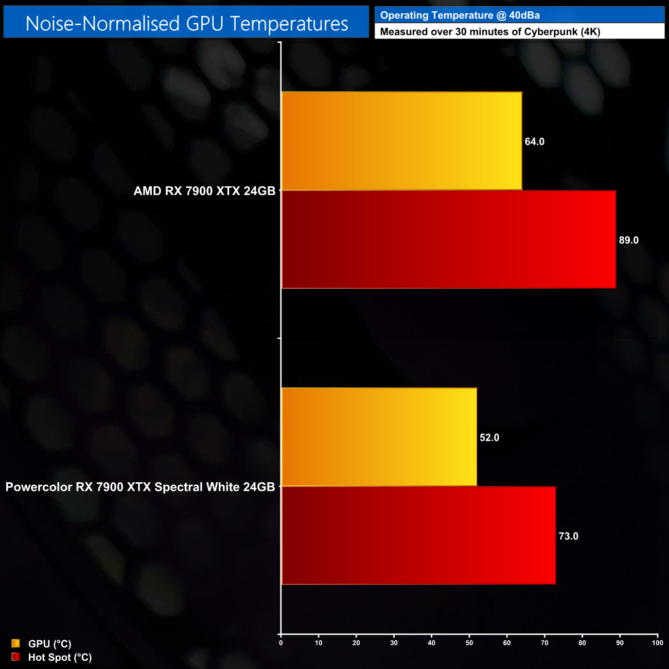 Moving onto noise normalised thermals, for this testing we had to increase fan speed up to 53%, or about 1675rpm, to hit 40dBa of noise. Unsurprisingly, the Spectral White really shines against the reference card here, with the GPU temperature peaking at just 52C, while the hot spot temperature hit 73C – a massive 16 degree reduction compared to AMD’s own card. The Spectral White is clearly just a much more efficient cooler.
