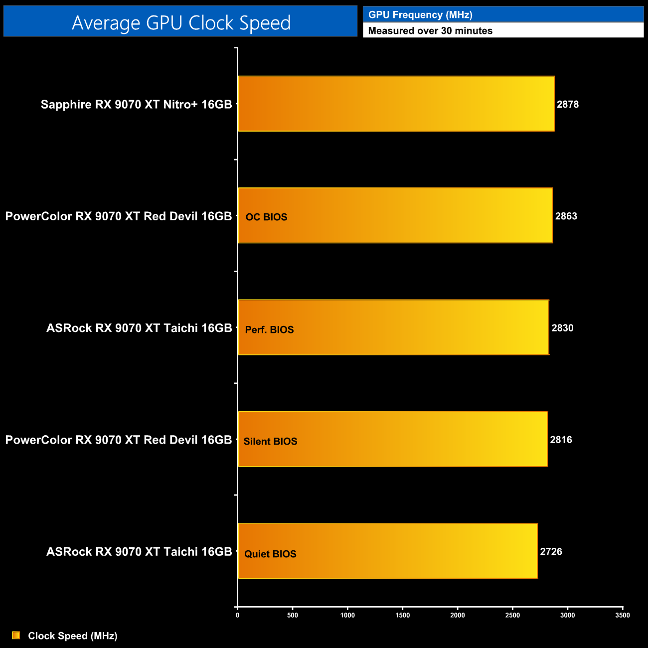 In fact, averaged over the thirty minute stress test, the Red Devil was less than 25MHz behind the Nitro+, so there's basically nothing in it.