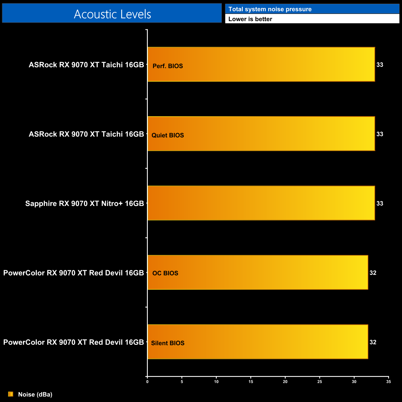 As for out of the box noise levels, we have tested a trio of very quiet graphics cards! The Red Devil is the quietest of the bunch however, as regardless of whether I was using the OC or Silent BIOS, the sound output was actually hitting the noise floor of my testing environment, at 32dBa. In other words, this is as quiet a graphics card as I am able to test, which is fantastic to see.