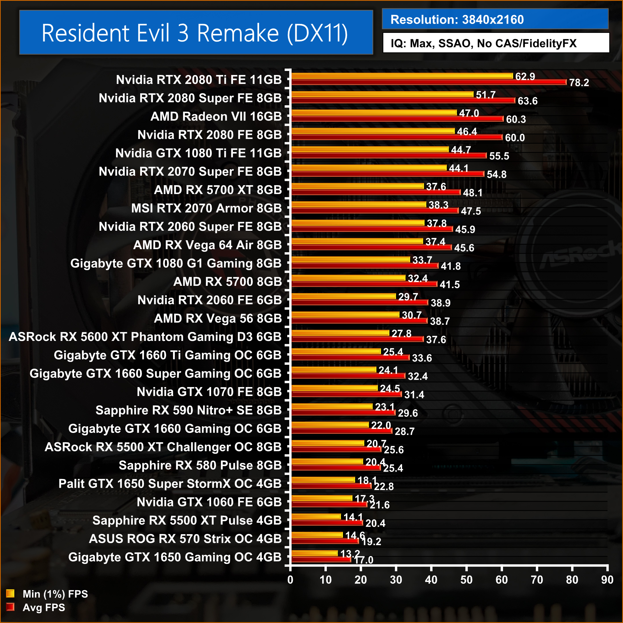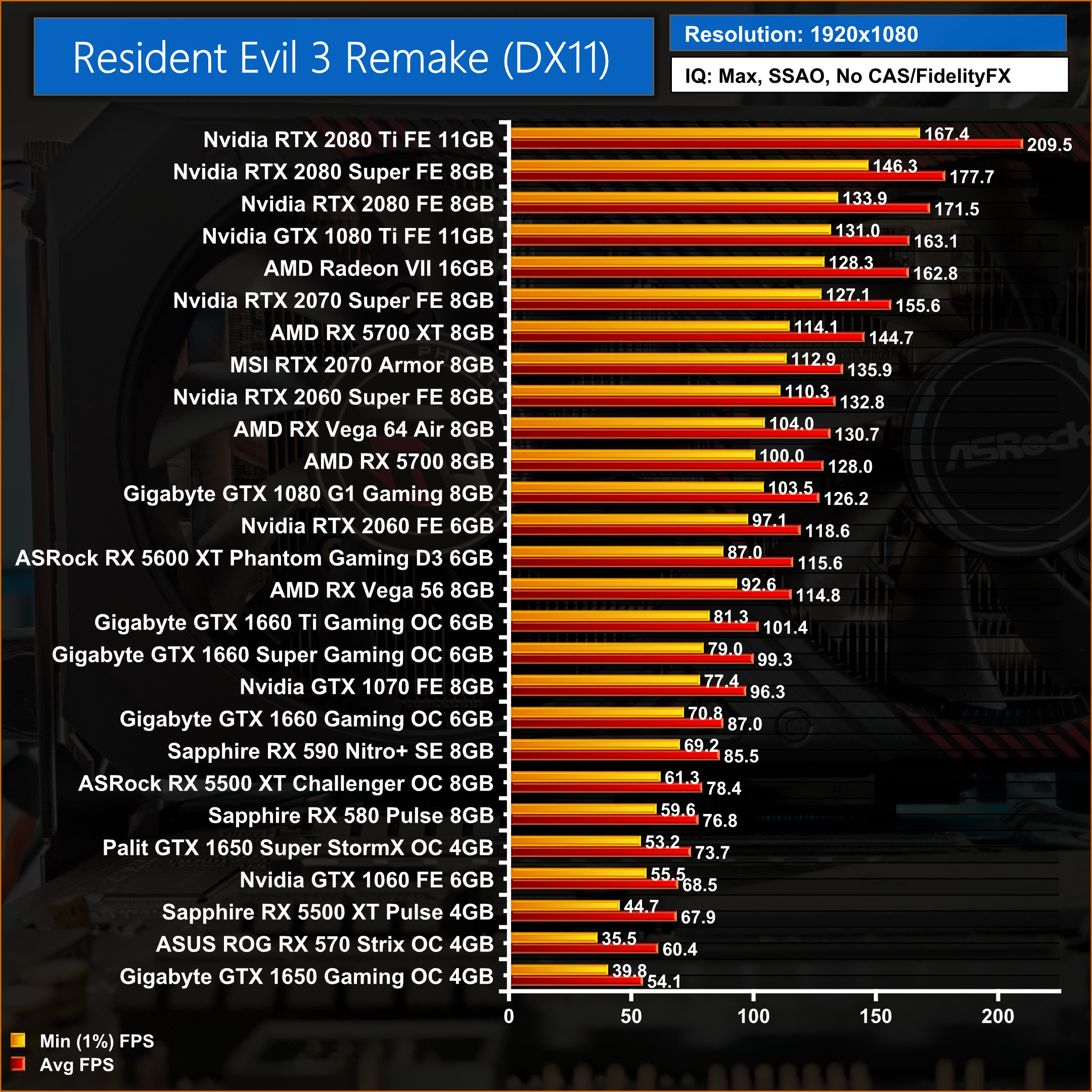I have to admit at being pleasantly surprised with how well the Resident Evil 3 Remake ran across all of the GPUs we tested, not just the high-end cards like the RTX 2070 or RTX 2080 Super. Even on relatively weak hardware, like the GTX 1650 non-Super, we saw average frame rates over 50fps, and bear in mind this was with image quality cranked up to the limit. I would say even more modest hardware will be able to hit 60fps at 1080p with only some slight tweaks to overall image quality.