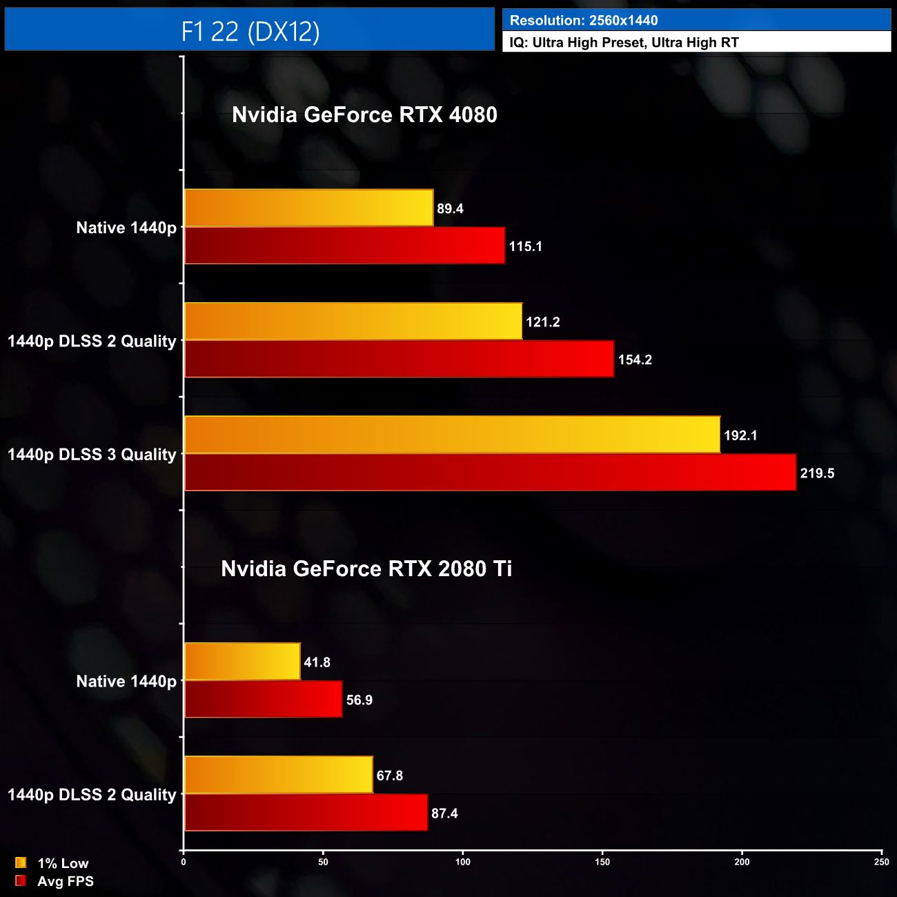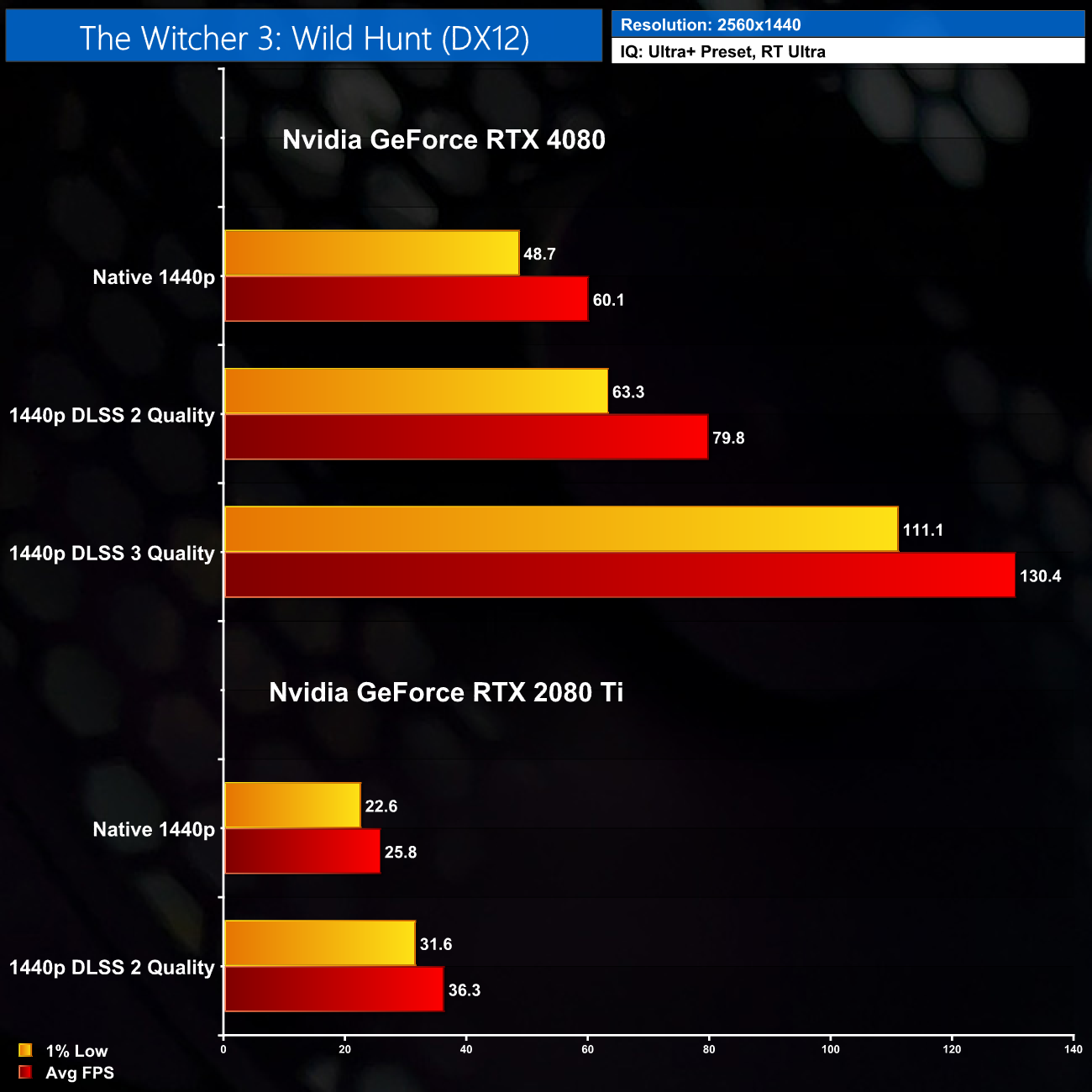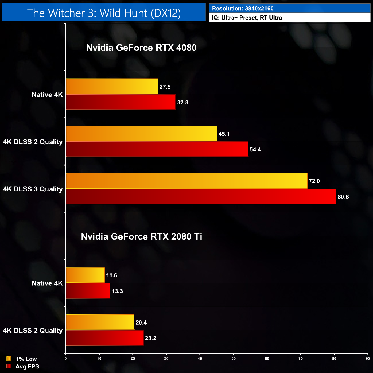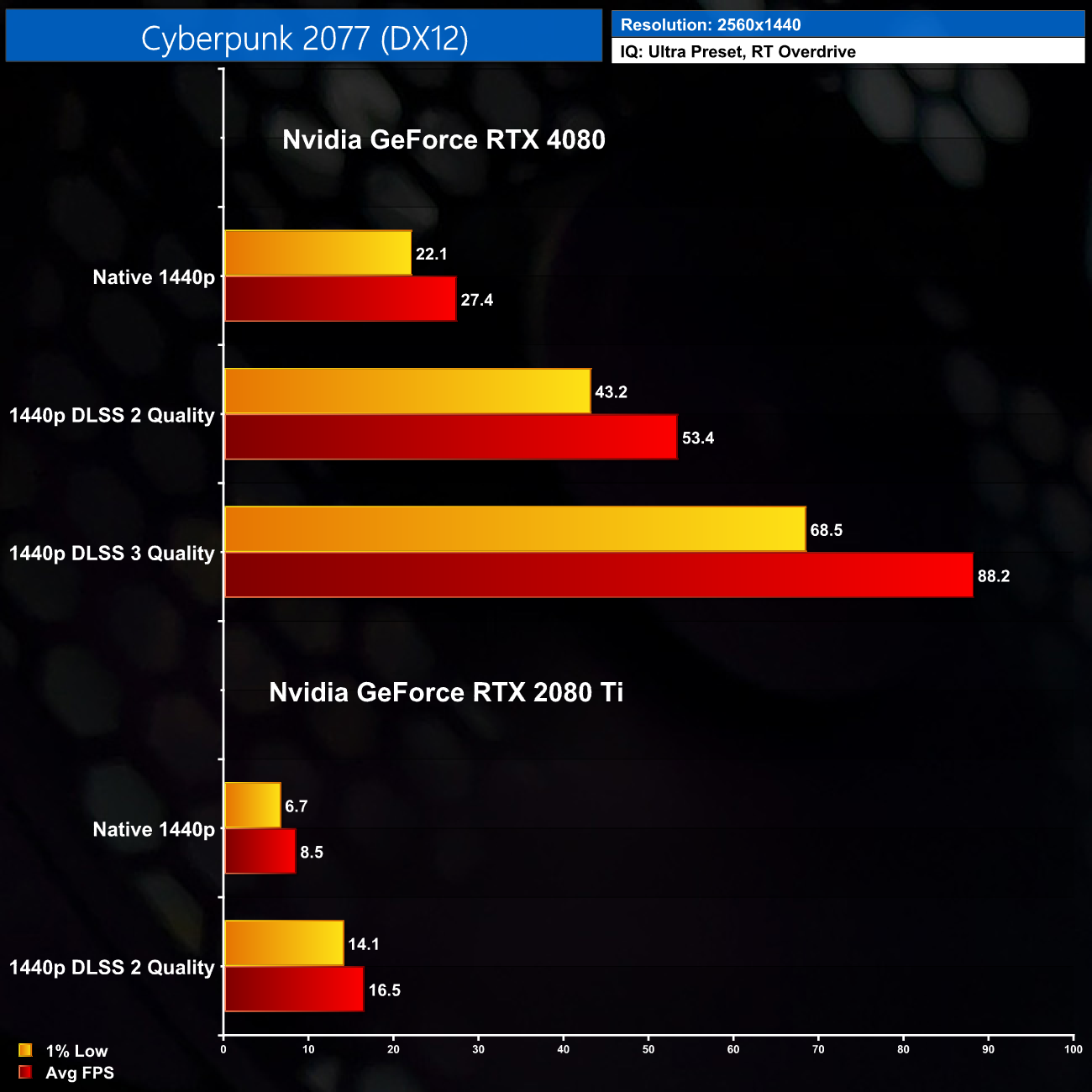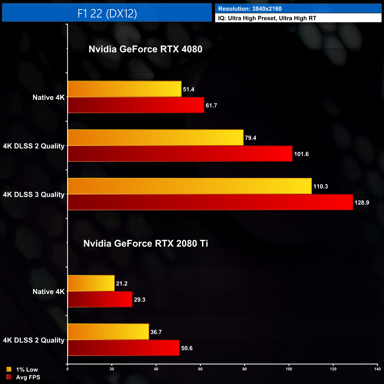 The RTX 2080 Ti isn't a completely lost cause though, the GPU still has some gas in the tank for certain games like F1 22, but it is really starting to show its age in more demanding titles. That's especially the case in games where ray tracing is heavily leveraged, just as we saw in the new Cyberpunk 2077 RT Overdrive mode, and in the new Witcher 3 update – those are the titles where the RTX 4080 delivered its biggest victories over the 20-series GPU.