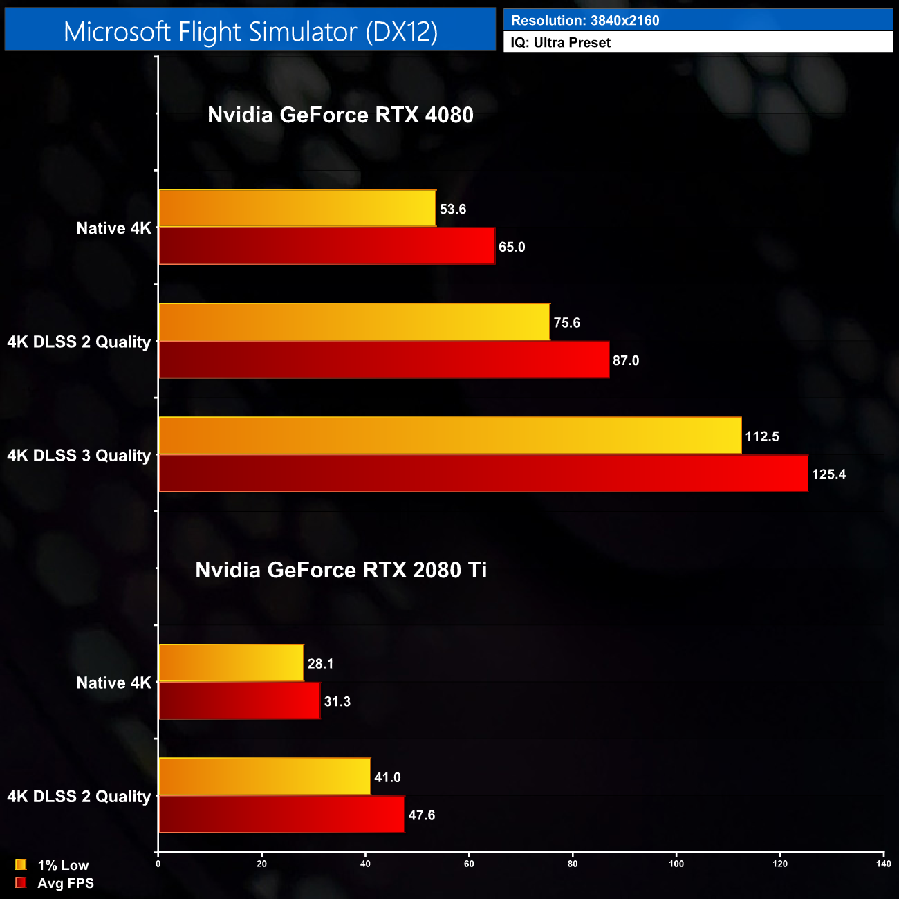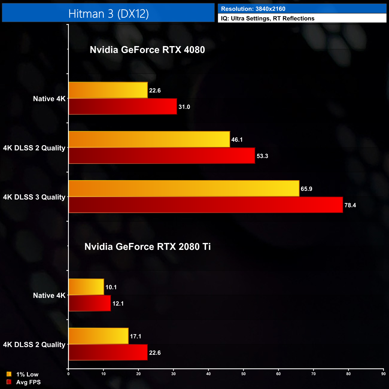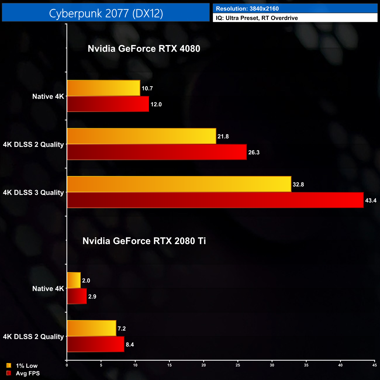 As mentioned, for the full analysis be sure to check out the video at the top of this page. It’s safe to say, however, that the RTX 4080 is significantly faster than the RTX 2080 Ti – that may sound obvious, but when comparing both GPUs using DLSS 2 Quality mode, the RTX 4080 came in on average 2.2 times faster at 4K.