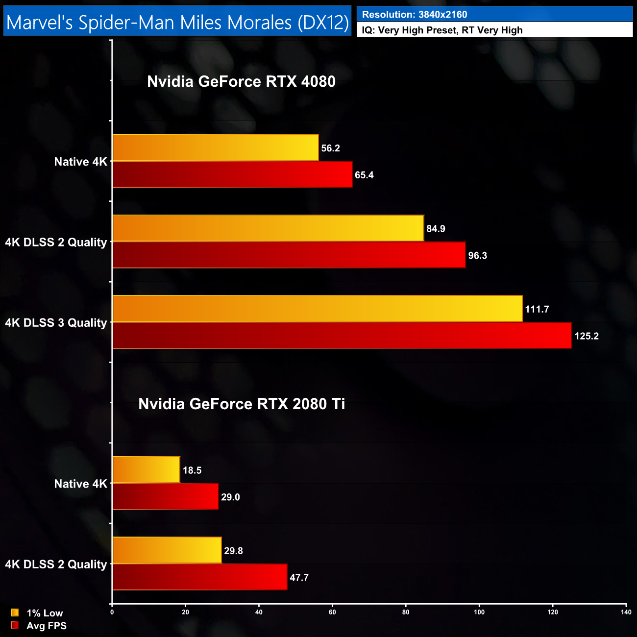 DLSS 3 makes a real difference however, as frame rates get taken to the next level and the upgrade becomes even more significant. We’re now talking, on average, a 3x boost – or 300% uplift for the RTX 4080 versus the RTX 2080 Ti, which of course cannot leverage DLSS 3 due to its older architecture.