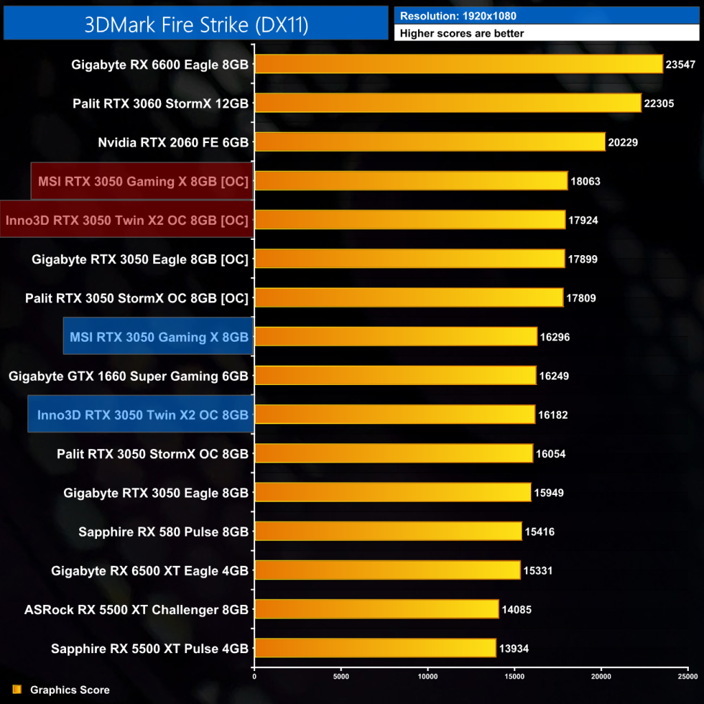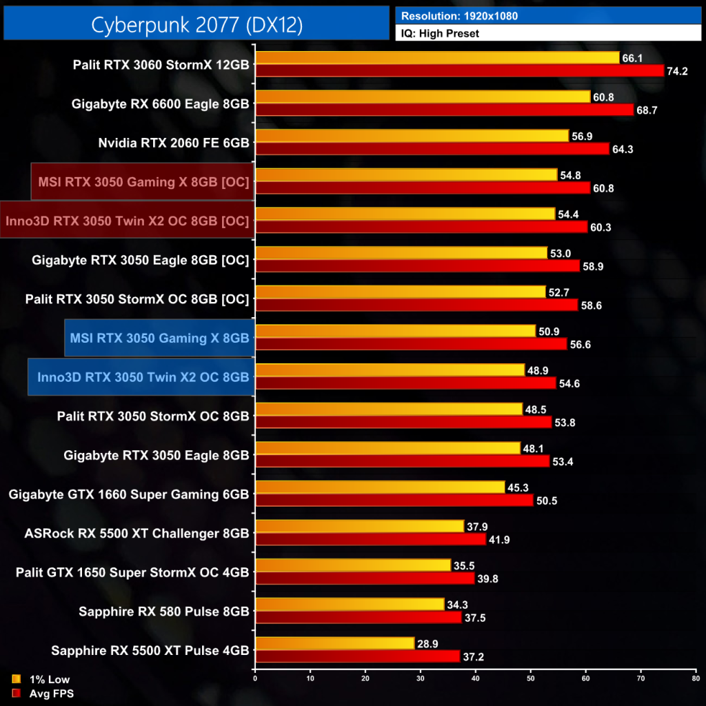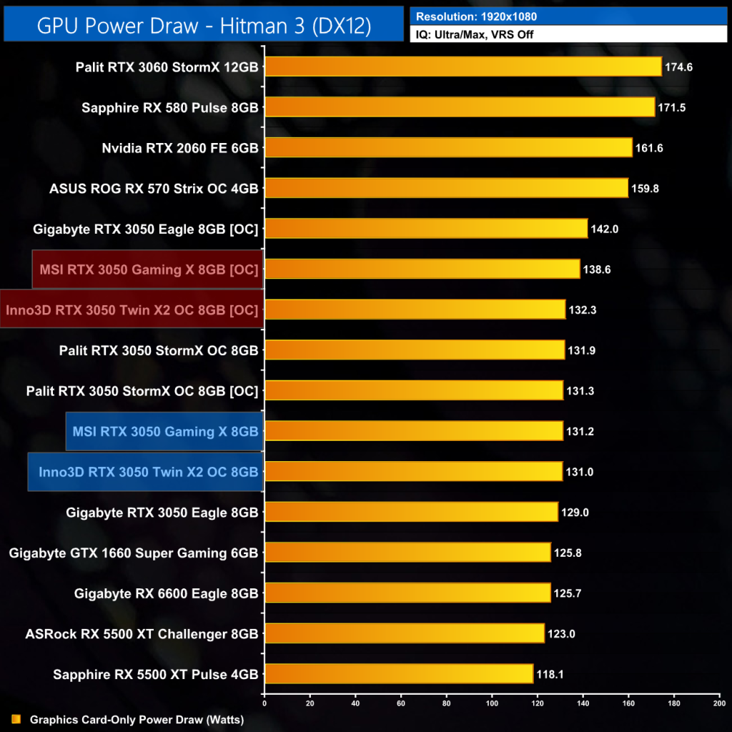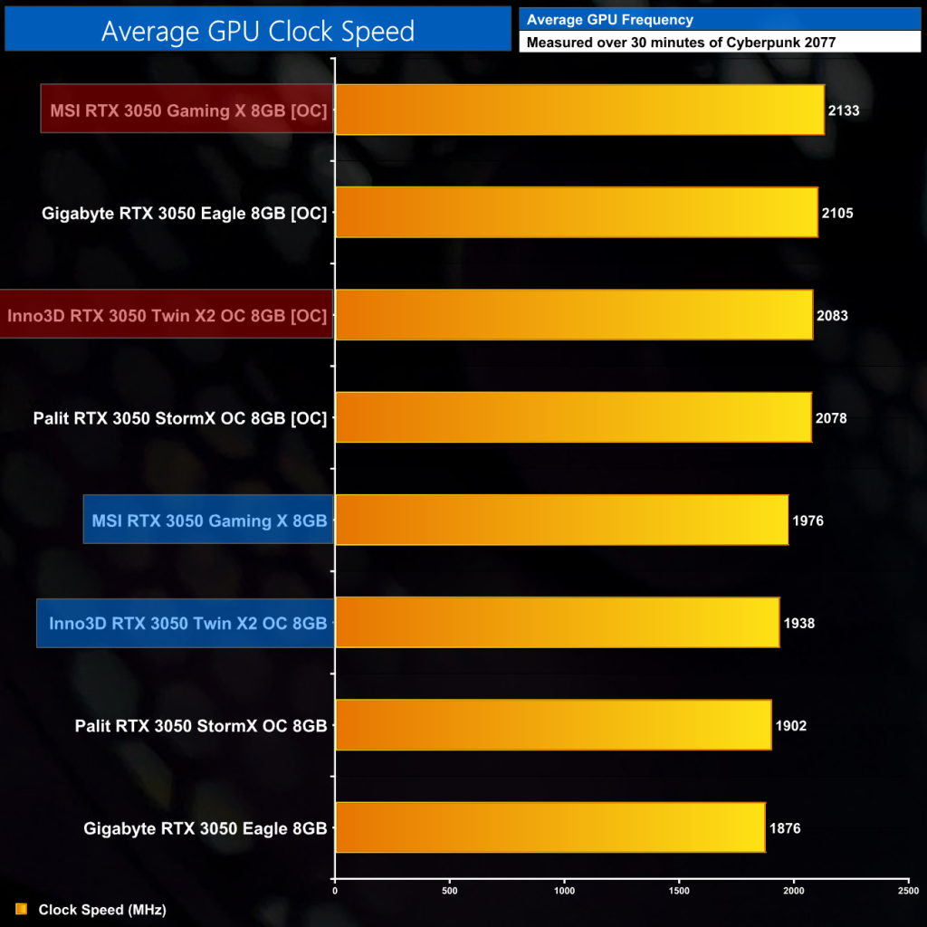 Interestingly, the Inno3D Twin X2 does not have an adjustable power limit, so it is locked at 130W. The MSI Gaming X can add another 7% to the power limit, allowing it to hit the highest clock speed of all four RTX 3050s we have tested. Even then, the Twin X2 OC is only just below the 2.1GHz figure, so it's still a decent result.