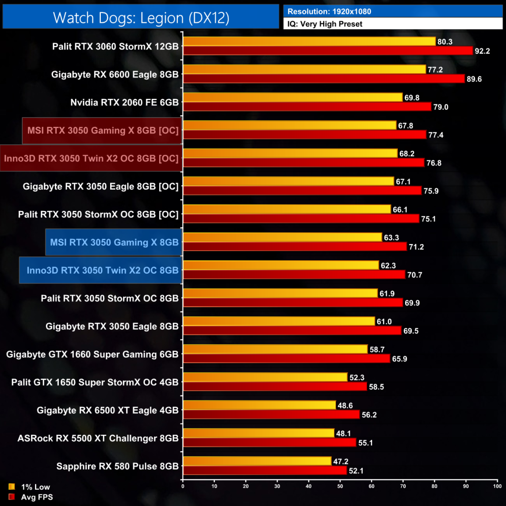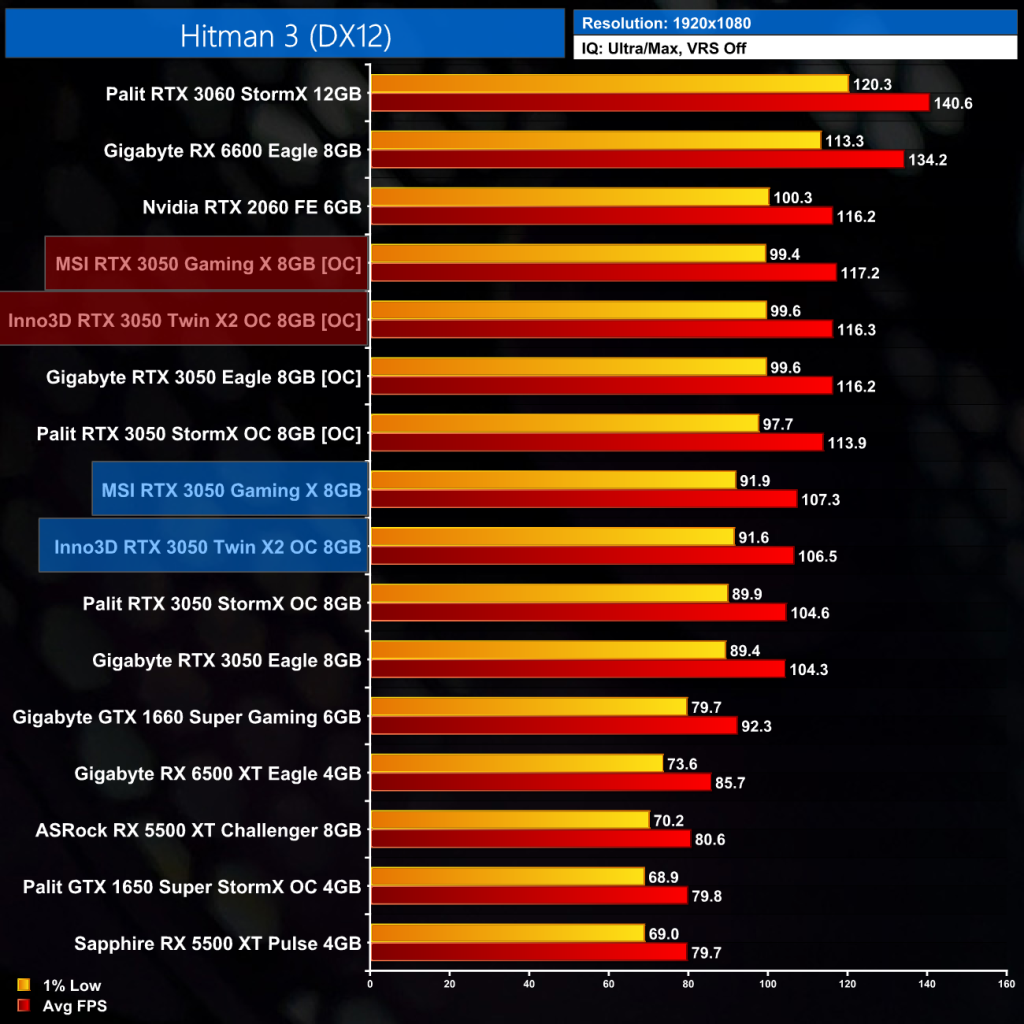 Overclocked performance is once more, very similar to the other two RTX 3050s we had already tested, in that we are looking at an extra few frames on average – though that does improve to over 10FPS in the case of Hitman 3. The Gaming X was able to extract an extra drop or two that the other models couldn't, but again, you're not going to be able to tell the difference in the real world.