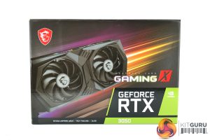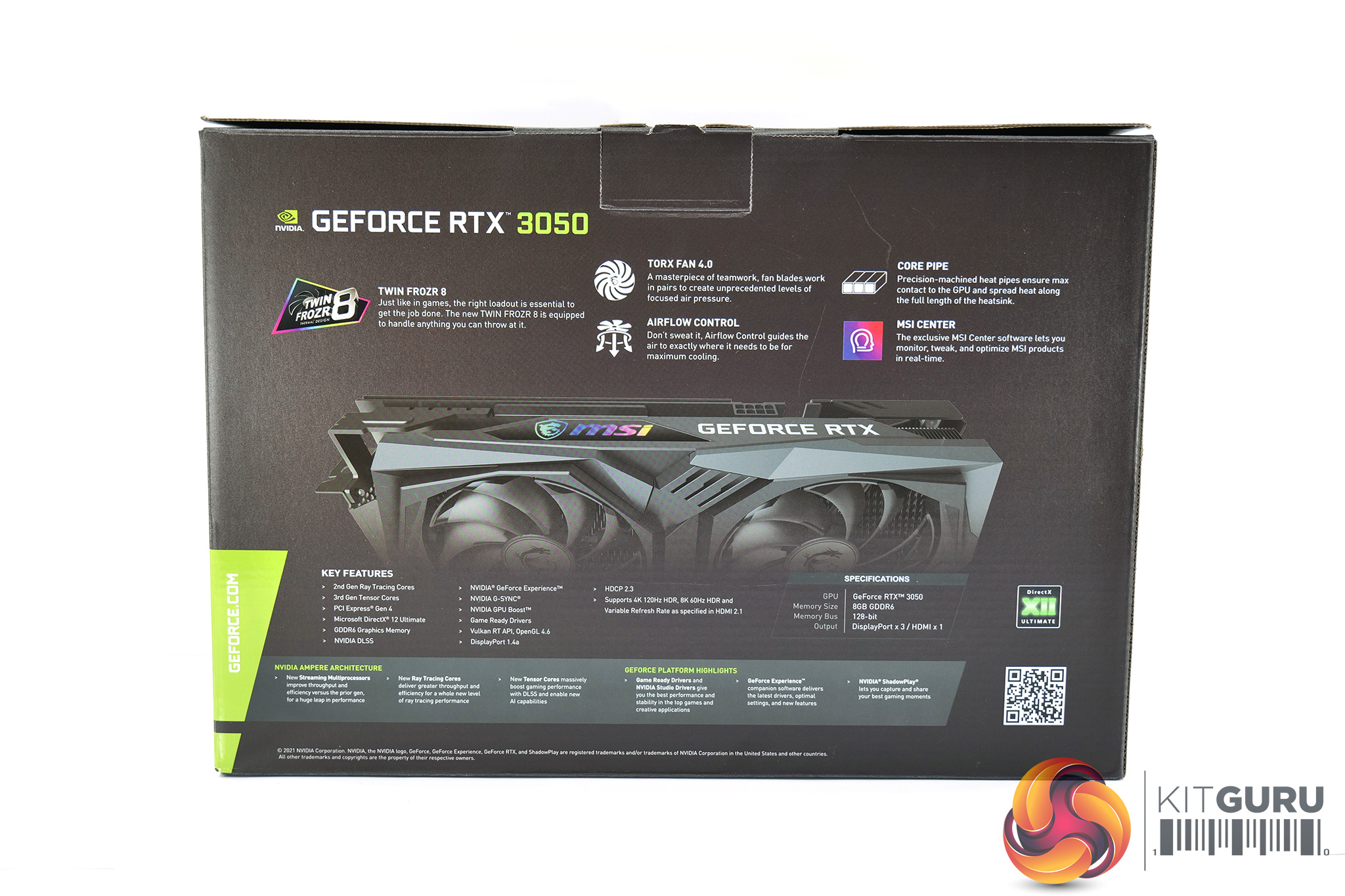 Looking now at the MSI RTX 3050 Gaming X, this card ships in a mostly dark brown box, but the front has a large image of the card itself as well as some yellow and purple accenting. The back of the box highlights a handful of the card's design features.