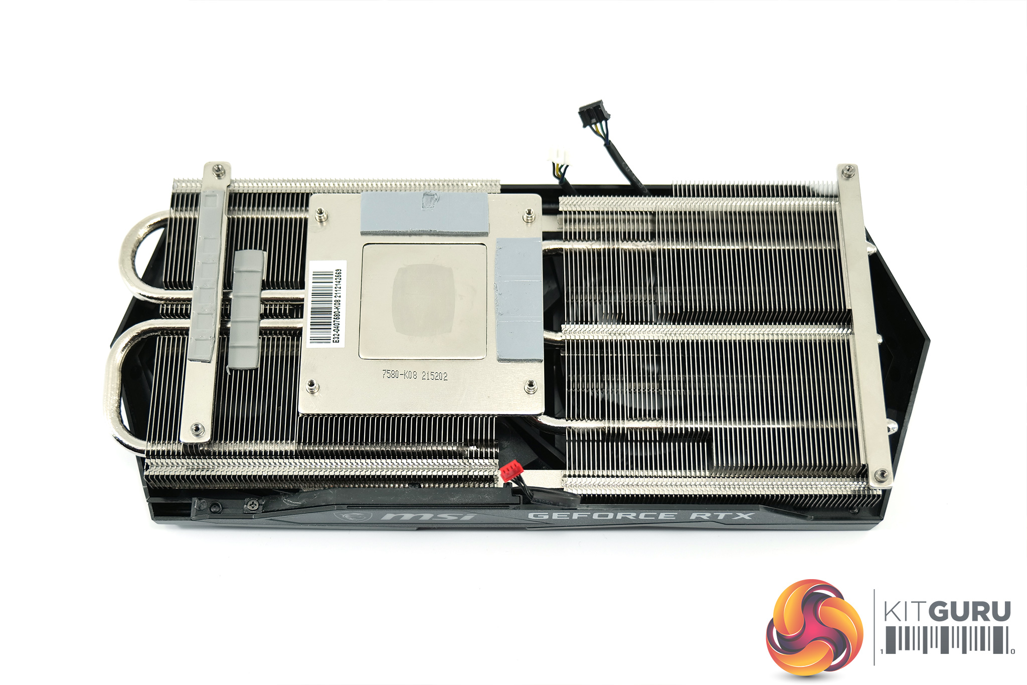 Then for the heatsink, it's an impressive-looking piece of engineering. It features two large and fairly dense finstacks, with a total of three heatpipes. Both the GPU and memory contact with a baseplate.