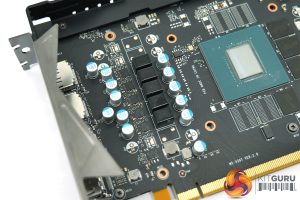 Moving to look at the PCB, we can see MSI has taken things a step further with the GPU VRM, which is a 5-phase design here – every other RTX 3050 card we have looked at so far uses a four-phase VRM. The memory VRM remains single-phase however.