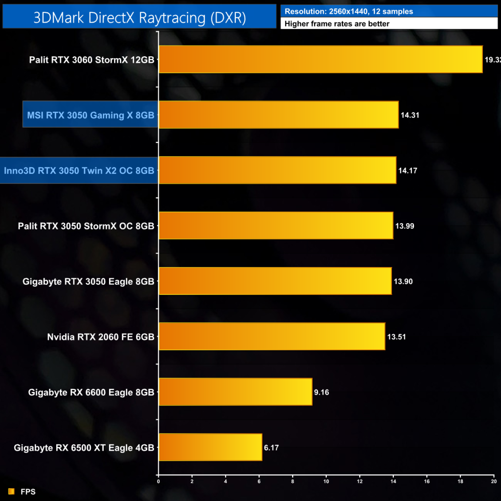 Likewise in the 3DMark DXR featuretest, the extra clock speed on offer from the MSI Gaming X and Inno3D Twin X2 helps boost performance, but even the Gaming X is not more than 3% faster than the Gigabyte Eagle.