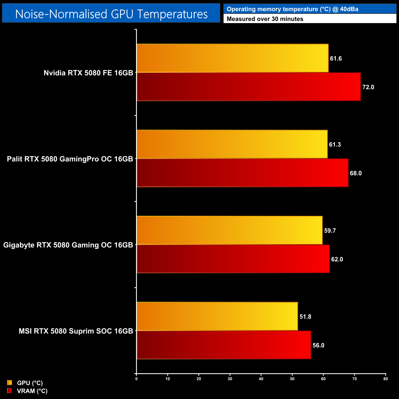 To really get an idea of the efficiency of each cooler, we re-test with noise output normalised to 40dBA. At the top we have the Founders Edition, running the hottest, though the GamingPro OC isn't a huge improvement, barely dropping GPU temperature, though VRAM thermals do improve by 4C. Next is the Gaming OC, with the GPU and VRAM and 59.7C and 62C, respectively, but there is a clear gulf between that and the MSI Suprim SOC. We would expect that one to perform the best considering it's the biggest and heaviest card on-test!