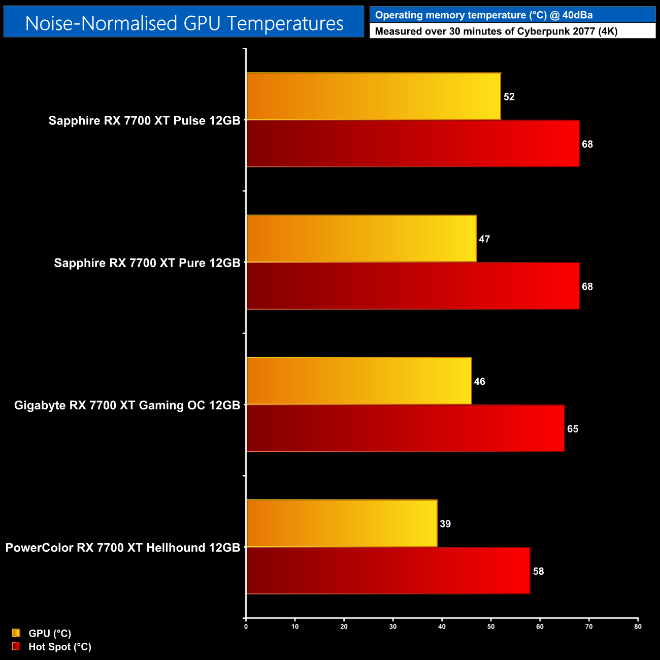 Noise-normalised thermals is where we finally start to see some differences between the models tested. Here, we increase fan speed until noise hits 40dBa, and then re-test thermal performance. Just a note, this doesn't take power into account – so cards that have higher power limits will typically run a little hotter, but it gives us a good idea about the relative efficiency of each cooler.