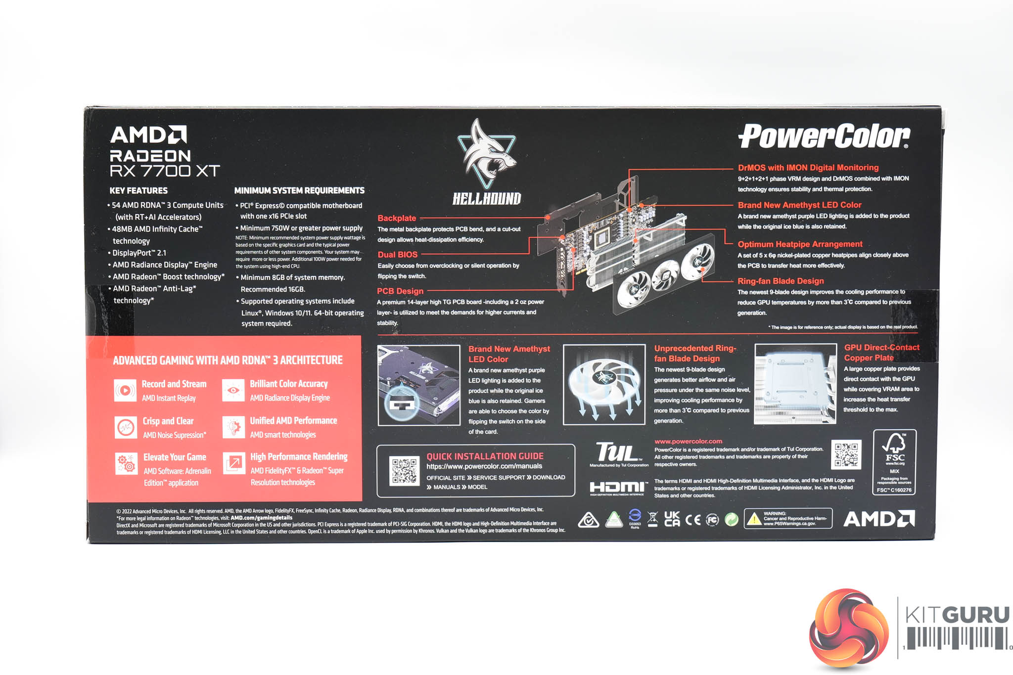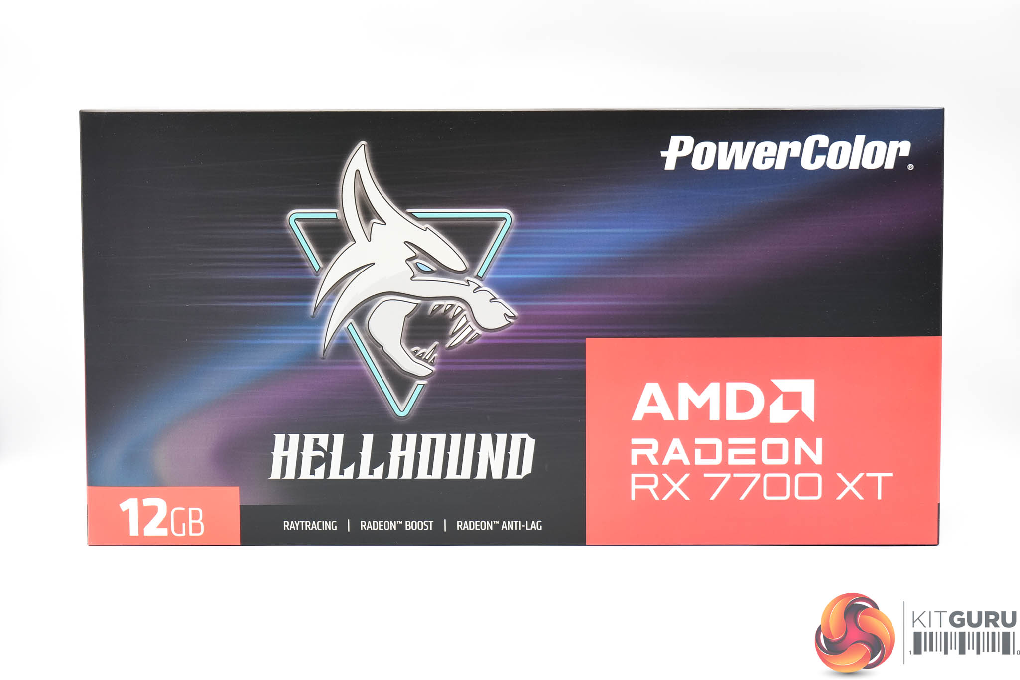 The PowerColor RX 7700 XT Hellhound ships in a mostly black box, but with the Hellhound logo dominating the front. AMD Radeon branding is positioned in the bottom left corner. On the back, PowerColor highlights various key features of the card, as well as system minimum requirements.