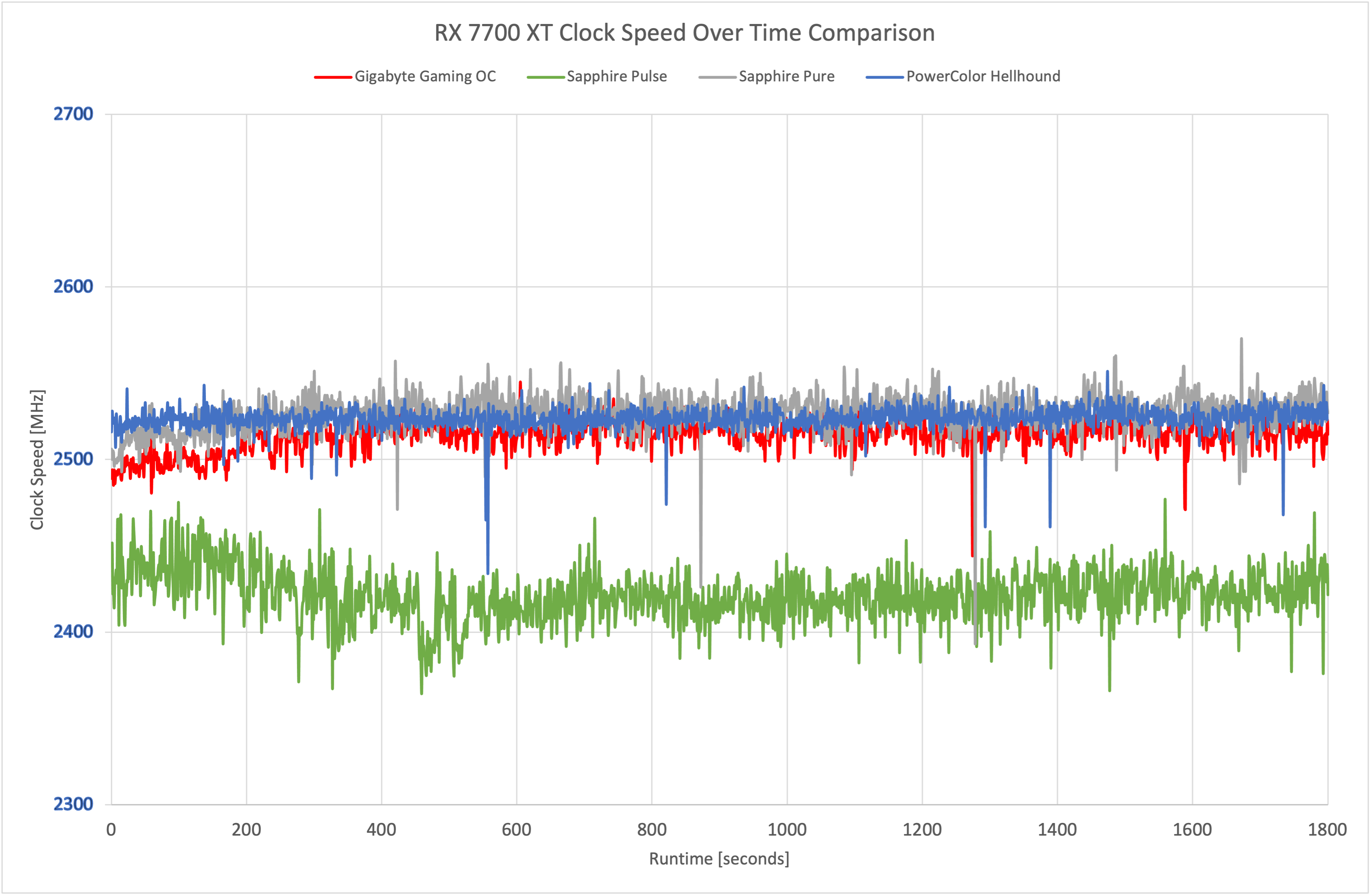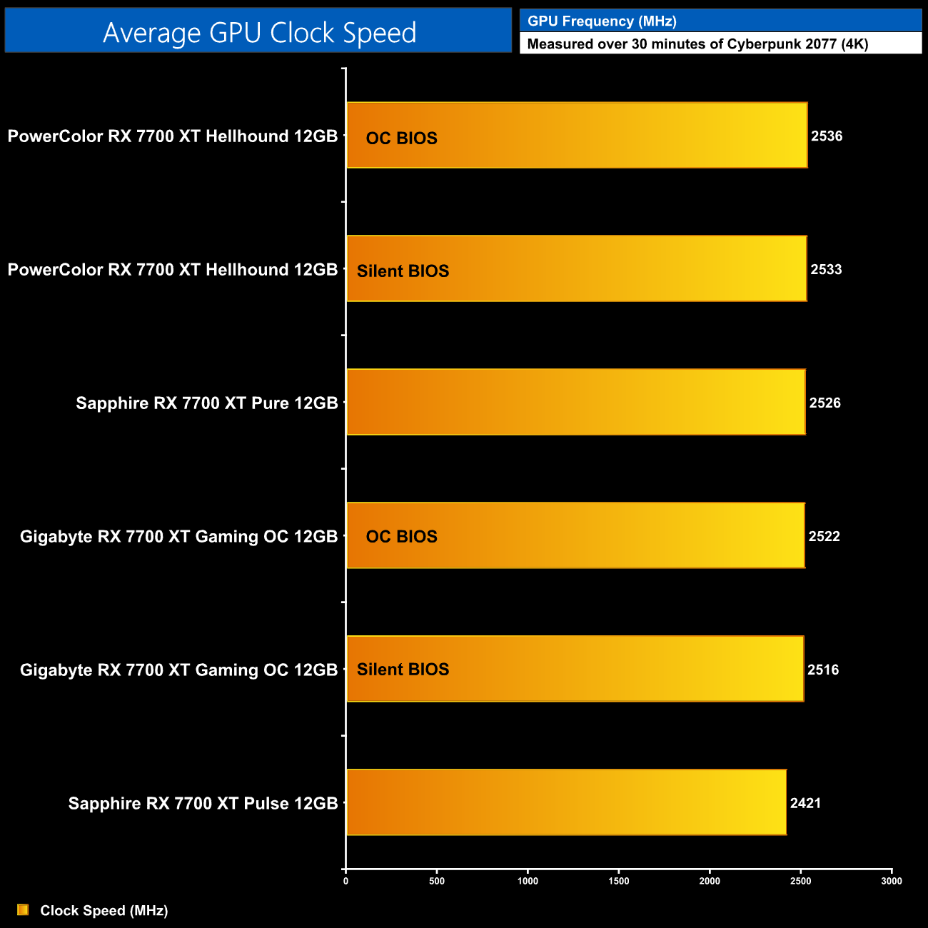 The reason for such close gaming performance becomes evidence when looking at clock speed – aside from the reference-clocked Sapphire Pulse, you can throw a blanket over the three factory overclocked cards as they all run within 20MHz of each other.