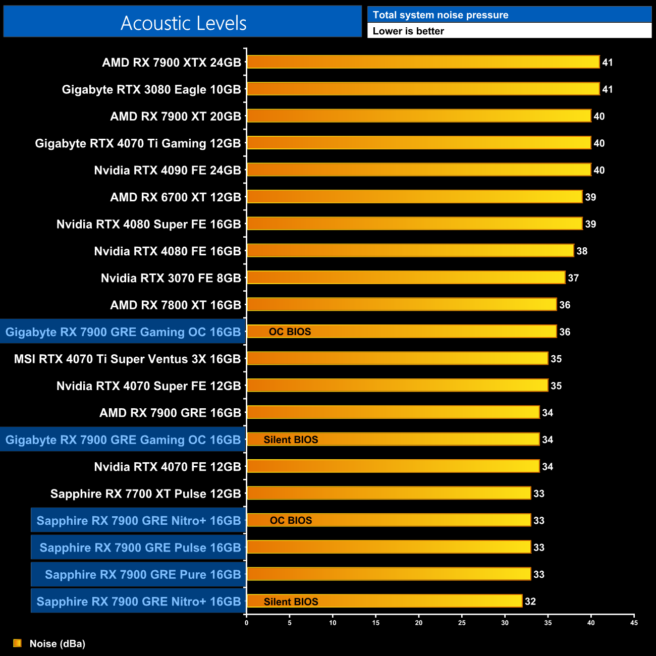 We take our noise measurements with the sound meter positioned 1 foot from the graphics card. I measured the noise floor to be 32 dBA, thus anything above this level can be attributed to the graphics cards. The power supply is passive for the entire power output range we tested all graphics cards in, while all CPU and system fans were disabled. A reading under load comes from running Cyberpunk 2077 for 30 minutes.