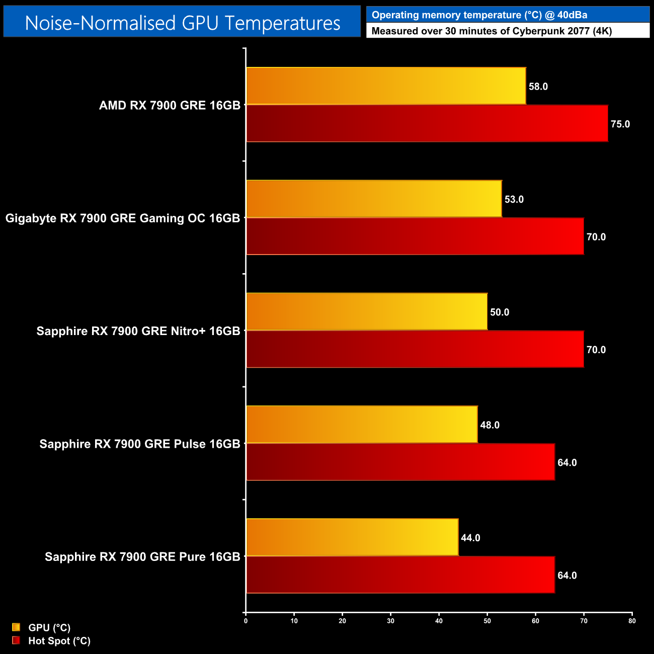 Following on from our stock thermal and acoustic testing, here we re-test the operating temperature of the GPU, but with noise levels normalised to 40dBa. This allows us to measure the efficiency of the overall cooling solution at varying noise levels as a result of more aggressive fan curves no longer being a factor.