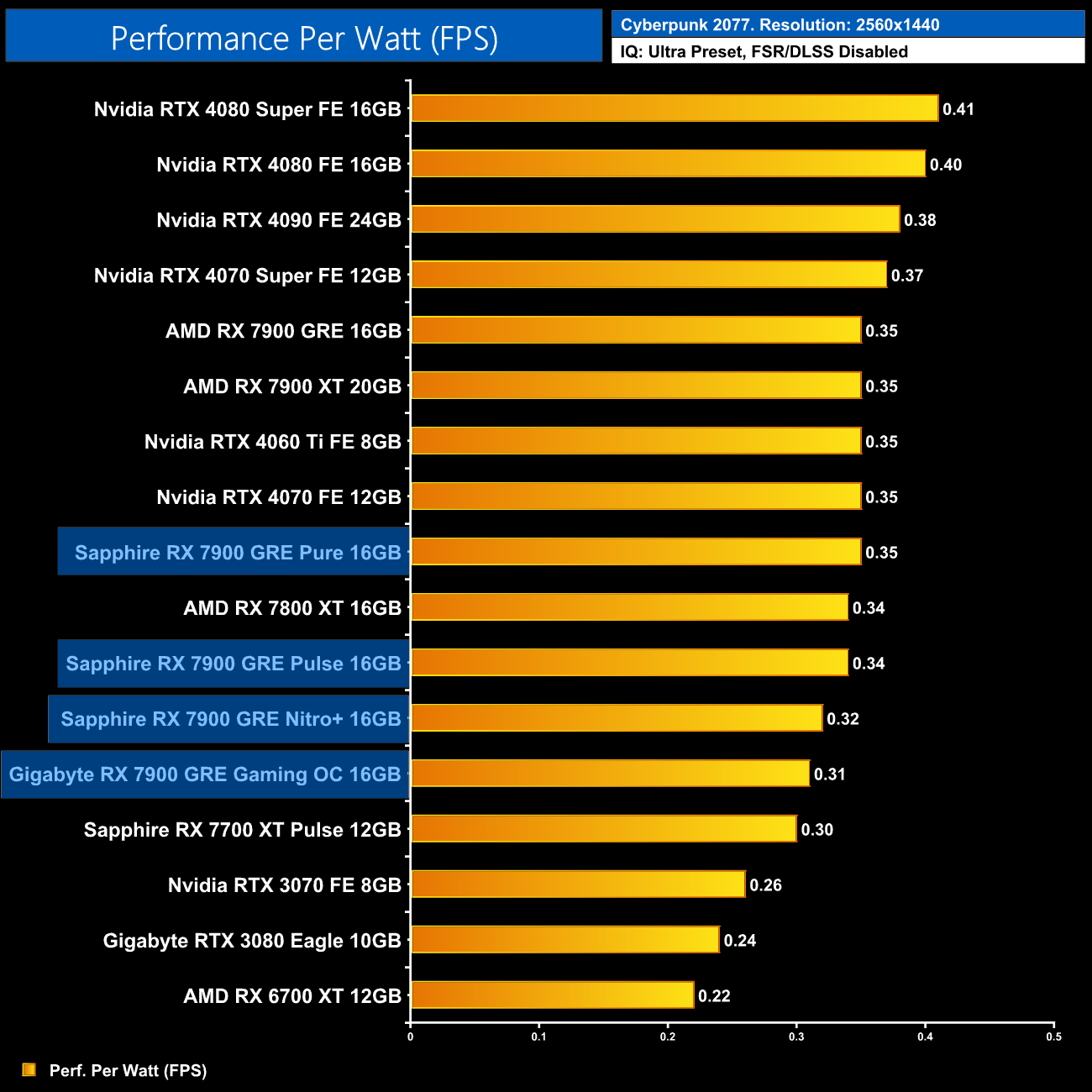 Interestingly, the large increases to power draw result in reduced efficiency for the Nitro+ and Gaming OC. The Pure is just as efficient as the AMD reference model, while the Sapphire Pulse is fractionally behind.