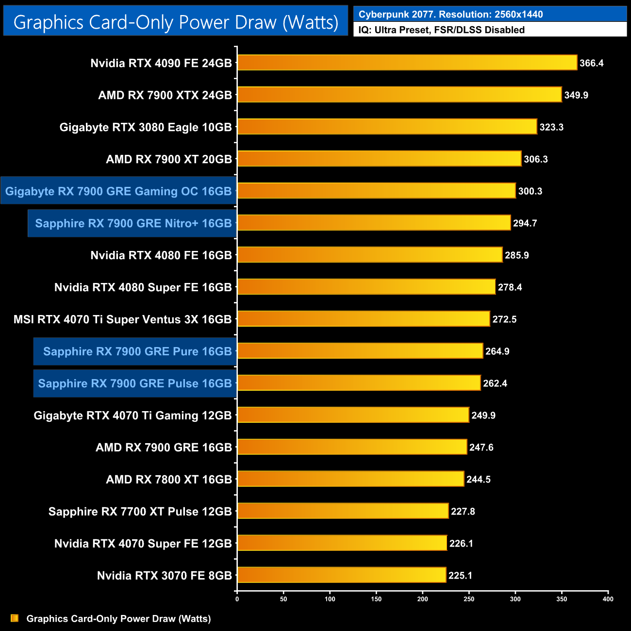 We use Nvidia PCAT to measure power draw of the graphics card only, with readings from both the PCIe slot and the PCIe power cables combined into a single figure. We use Cyberpunk 2077 (1440p) for this testing.