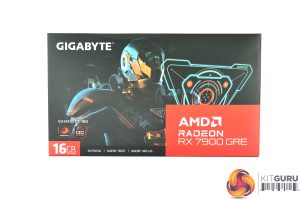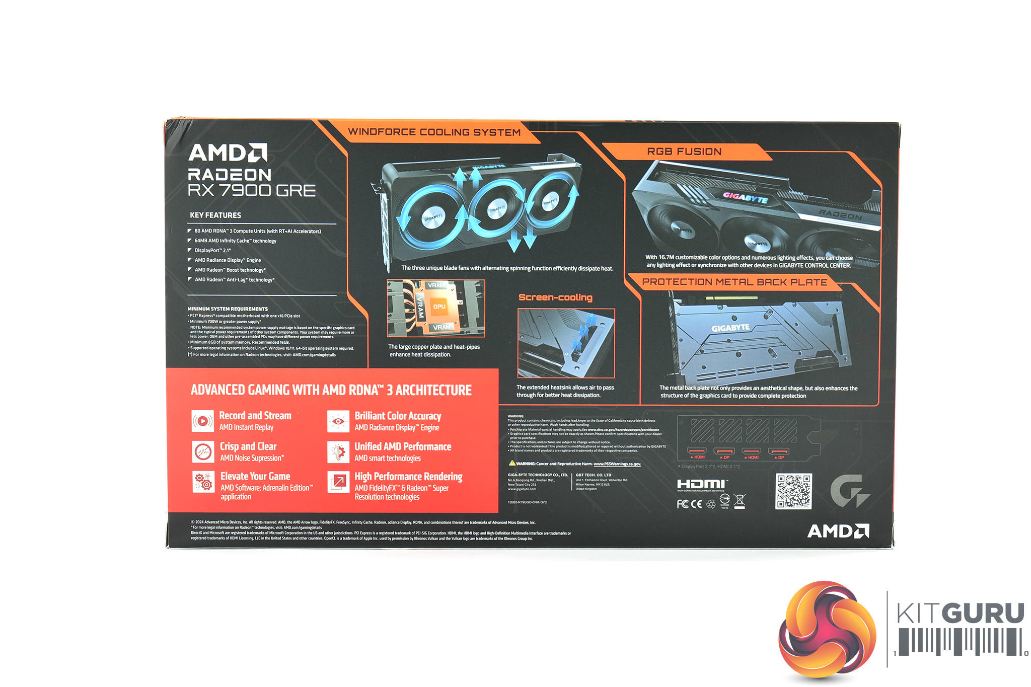 The Gigabyte RX 7900 GRE Gaming OC ships in a black box, with a futuristic-looking image of some sort of cyber soldier on the front. On the back, the company highlights a few key features of the card and the Windforce cooler.
