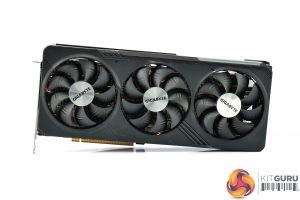 The front side of the card is home to a glossy plastic section, with the Gigabyte logo housed within it acting as the only RGB zone on the card. This uses a rainbow-style effect out of the box but can be configured using Gigabyte Control Center software.