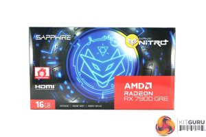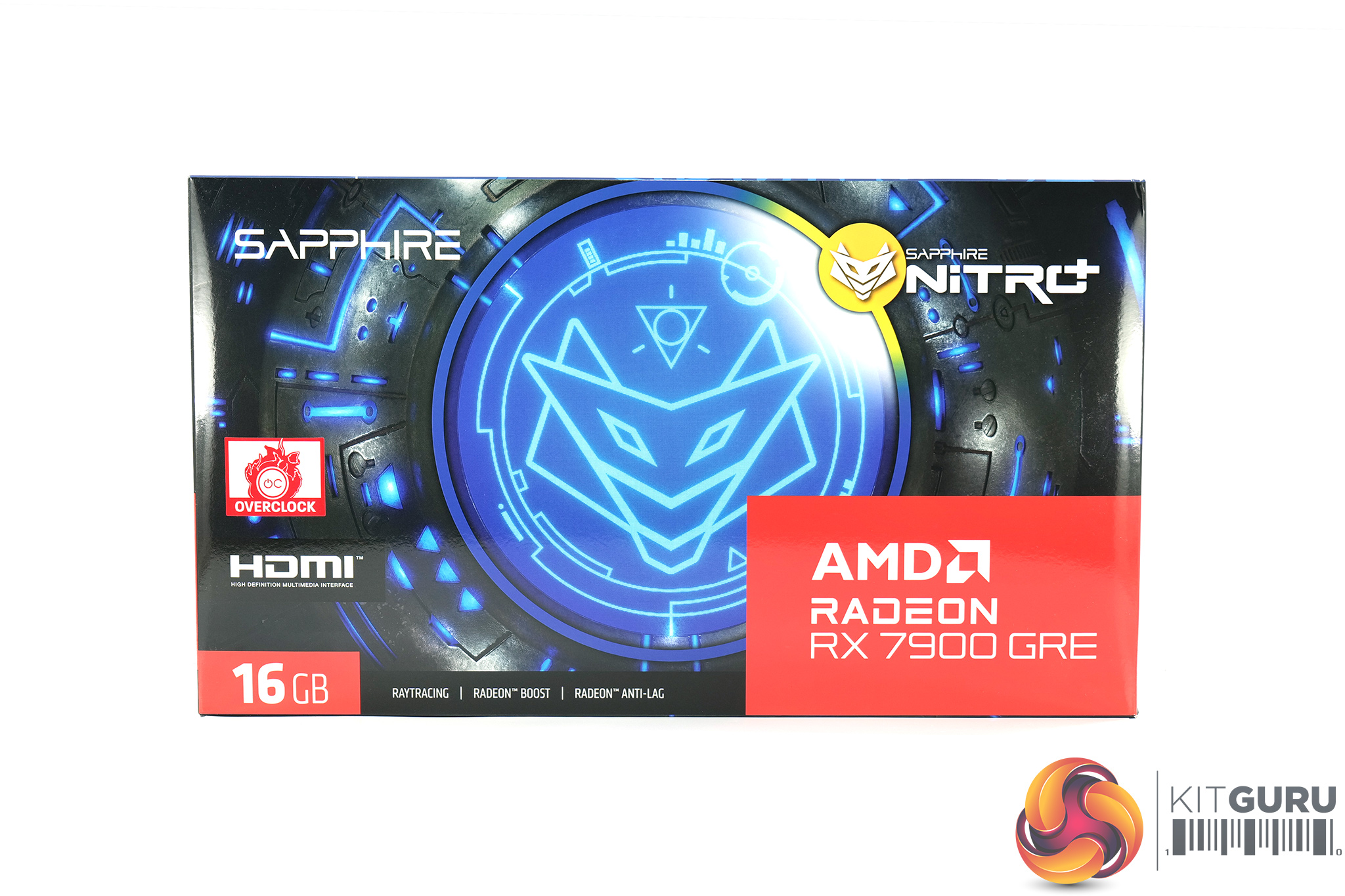 The Sapphire RX 7900 GRE Nitro+ ships in a mostly black and blue box, but with a large Nitro+ logo dominating the front. On the back, the company highlights required specifications and there's some marketing-speak about the card.