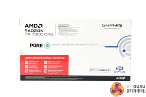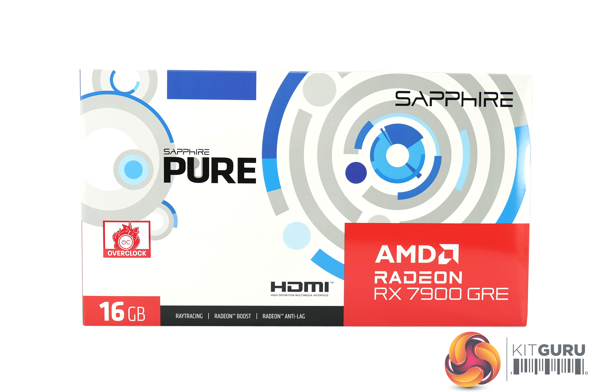 The Sapphire RX 7900 GRE Pure ships in a white and blue box, with a large AMD Radeon logo and 7900 GRE branding in the bottom corner.